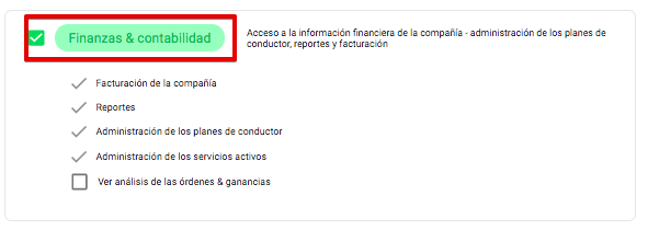 3. El usuario de Finanzas & contabilidad tiene acceso a la información financiera de la empresa - gestión del plan de conductor, informes y facturación.
