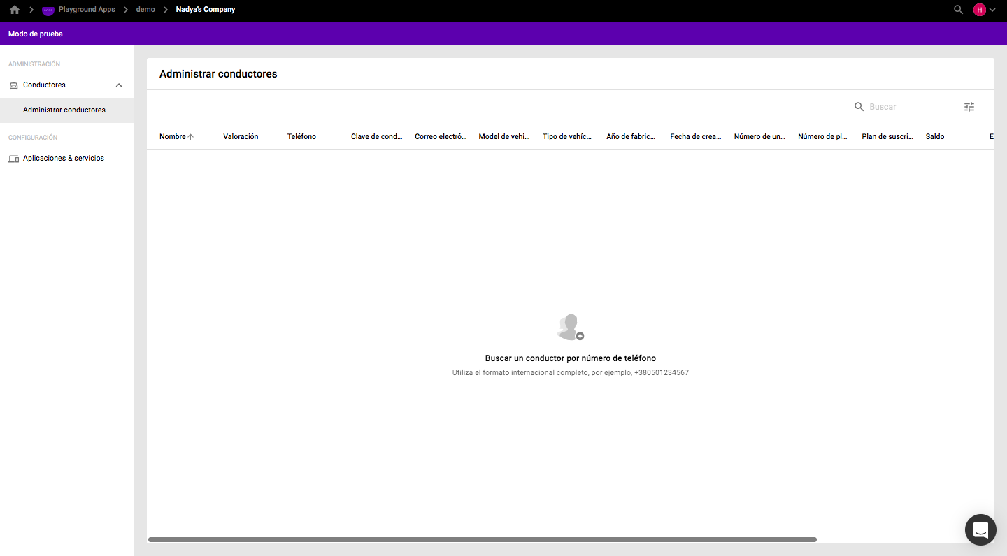 La búsqueda funciona exclusivamente por número de teléfono del conductor con o sin "+". Los resultados se muestran solo con la coincidencia de números completos. Dicho usuario tiene un nivel de acceso de "solo lectura" a la información del perfil del conductor.