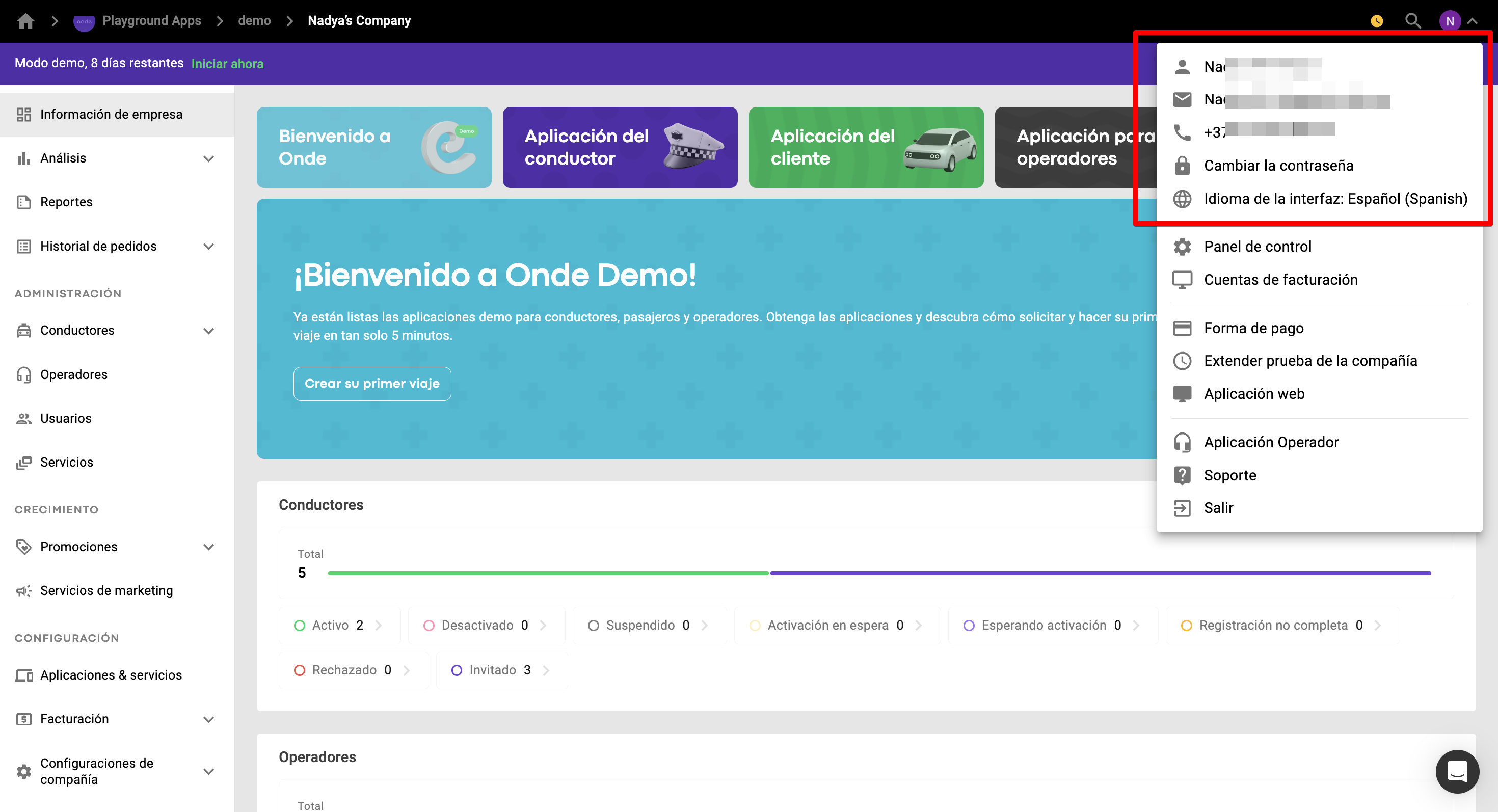 2. El usuario Conductores y operaciones tiene acceso a los conductores, operadores y servicios para verlos y realizar operaciones.