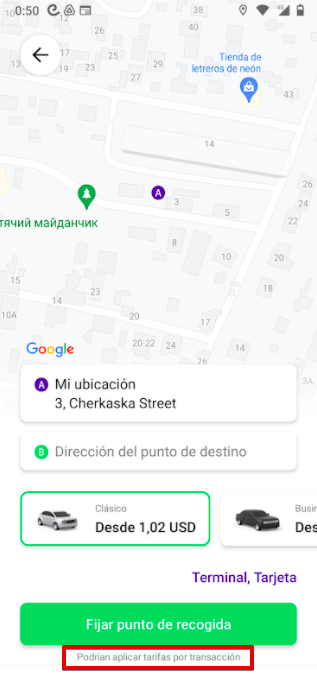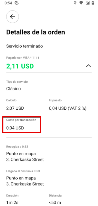 El saldo del Conductor para los viajes pagados con tarjeta se acredita con el costo final del viaje, excluyendo la tarifa por transacción, por lo tanto, la comisión del conductor no se cobra sobre la tarifa por transacción del Cliente.