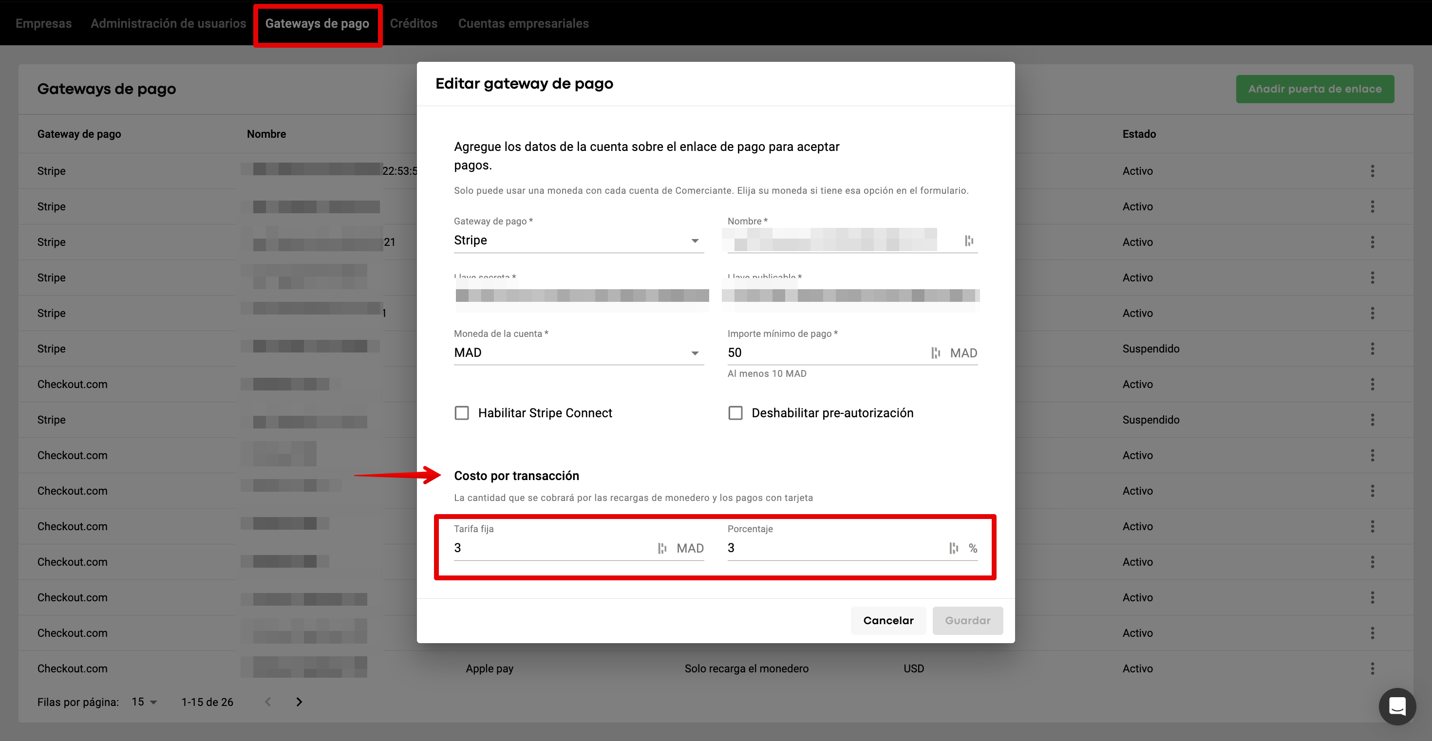 5. Busca los campos de configuración de la comisión de la transacción
