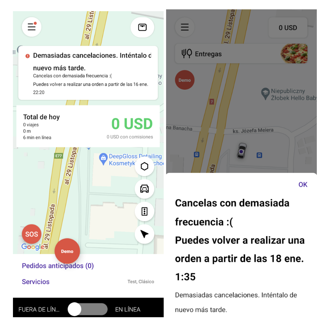 La aplicación mostrará una notificación: "Demasiadas cancelaciones. Inténtelo de nuevo más tarde. Pedidos suspendidos hasta ... "