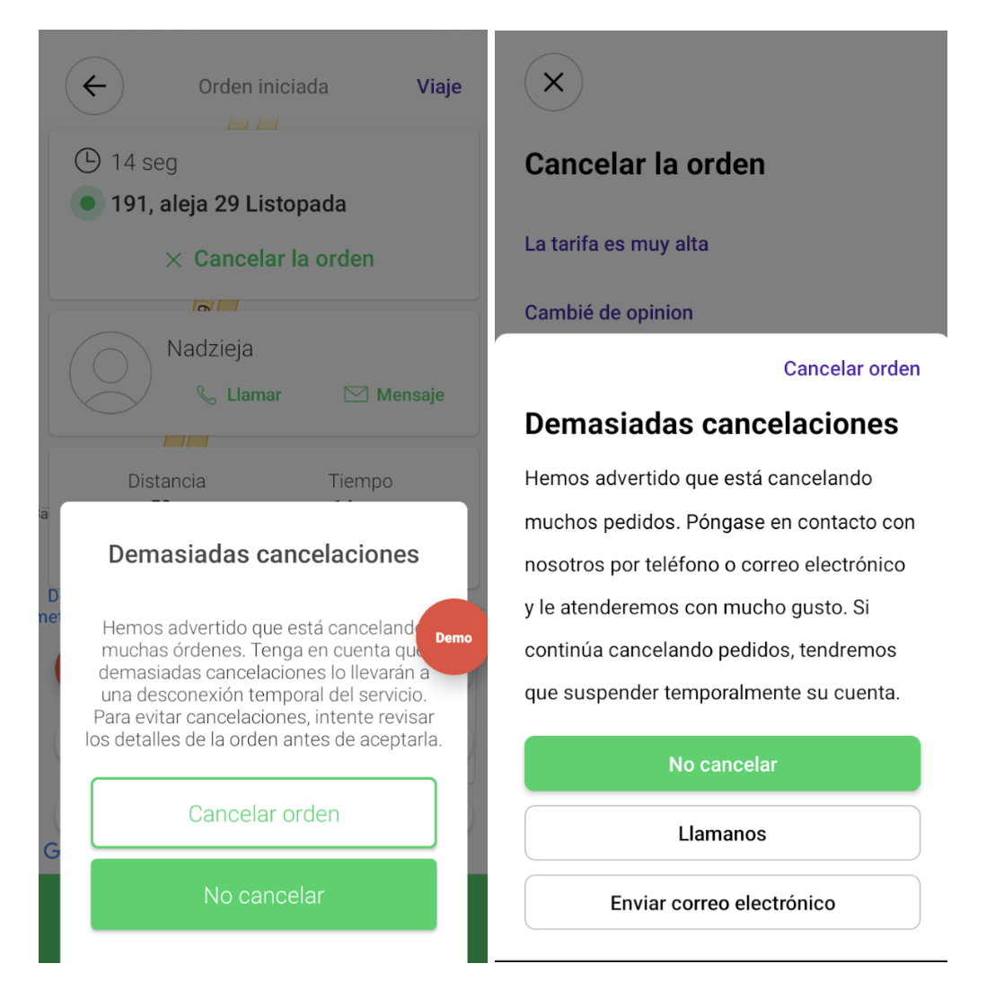 La aplicación del conductor/cliente mostrará una notificación en la aplicación diciendo "Demasiadas cancelaciones".