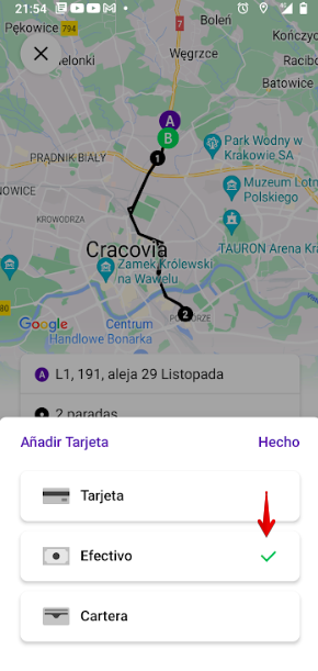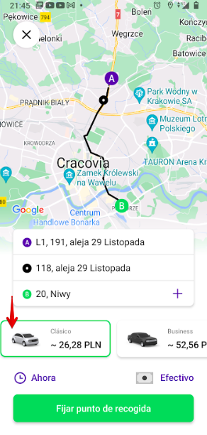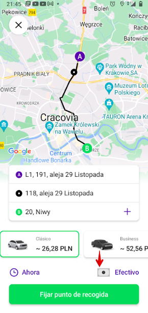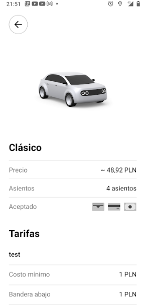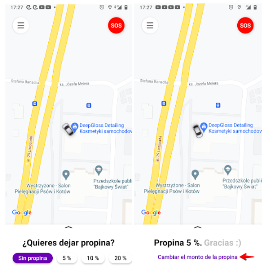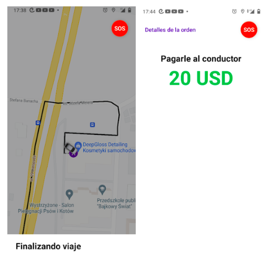 La aplicación te notifica una vez que el conductor está cerca del destino. Después de que el conductor "desliza para finalizar” el viaje y confirma el costo final, se te ofrece seleccionar el método de pago (en caso de que se hayan preseleccionado efectivo o terminal) o se carga automáticamente la tarjeta (si está disponible y no se ha preseleccionado ningún método de pago antes del viaje).