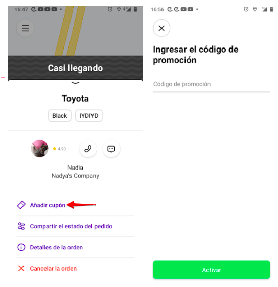 Puedes añadir un cupón en cualquier momento una vez que se haya asignado la orden hasta que el conductor "desliza para finalizar” el viaje.