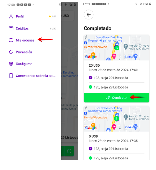 Todos los recibos de viajes pasados, así como las órdenes planificadas, se almacenan cronológicamente en la subpestaña "Mis órdenes" de tu perfil. Simplemente toca en el botón "Más elementos" en la esquina superior izquierda de tu aplicación y selecciona "Mis órdenes".