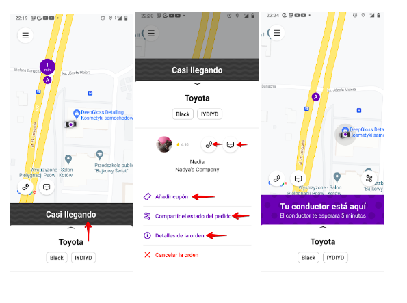 Desde el momento en que la orden es aceptada por el conductor (consulta las pantallas anteriores), puedes: