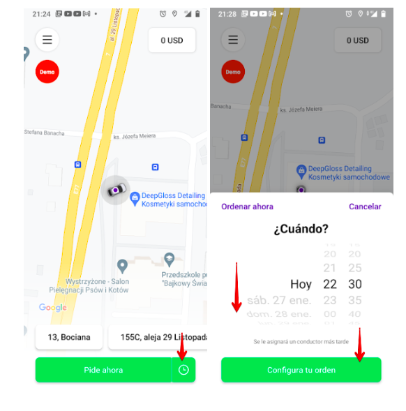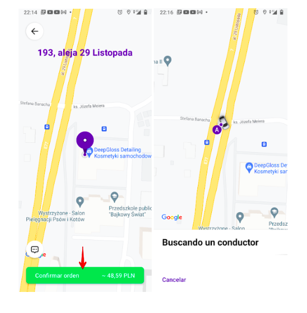 Ahora que todo está bien: el servicio, la recogida y destino, y la estimación/costo fijo final, simplemente procede con "Confirmar orden" y la reserva se envía a los conductores según el algoritmo de cola inteligente. El sistema te mantiene informado sobre la búsqueda de conductores y la aceptación de la orden.