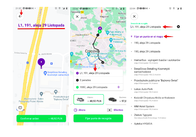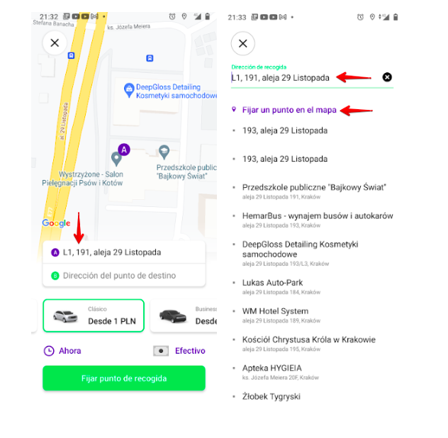 Simplemente empieza a escribir la nueva dirección de recogida y selecciona la dirección de la lista desplegable de lugares ofrecidos o "Fijar un punto en el mapa".