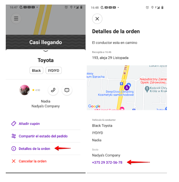 El número de teléfono del conductor está disponible en los recibos de viajes dentro de la aplicación para los viajes pasados durante los próximos 30 minutos después de una orden. Esto es para casos en los que un cliente pudo haber olvidado alguna pertenencia en el coche durante el viaje o similar. Después de 30 minutos, el cliente solo puede contactar a la empresa.