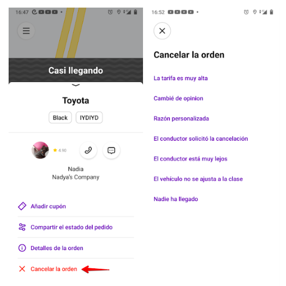 Puedes cancelar la orden en cualquier etapa desde el momento en que se crea hasta que el conductor "desliza para iniciar” el viaje.