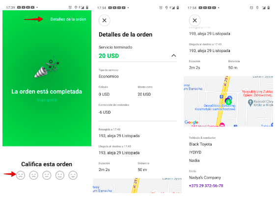 Puedes revisar los "Detalles de la orden": datos del conductor/vehículo, direcciones de recogida/destino, número de teléfono de la empresa en la pantalla una vez que se acepta la orden hasta que el conductor "desliza para finalizar” el viaje.
