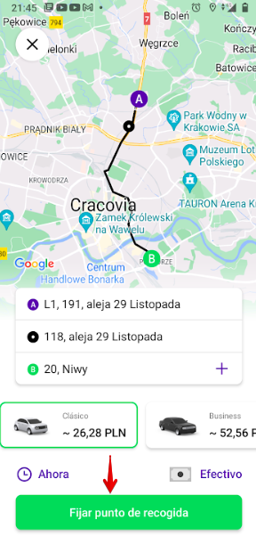 Una vez que hayas especificado el servicio y el método de pago preferido, toca en "Fijar punto de recogida".