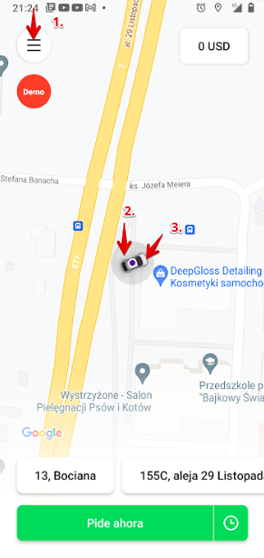 Después de eso, añade el lugar de destino tocando en el campo "Dirección del punto de destino" (este paso se puede omitir en caso de que el punto de destino no haya sido configurado como “requerido” por el proveedor de los servicios).