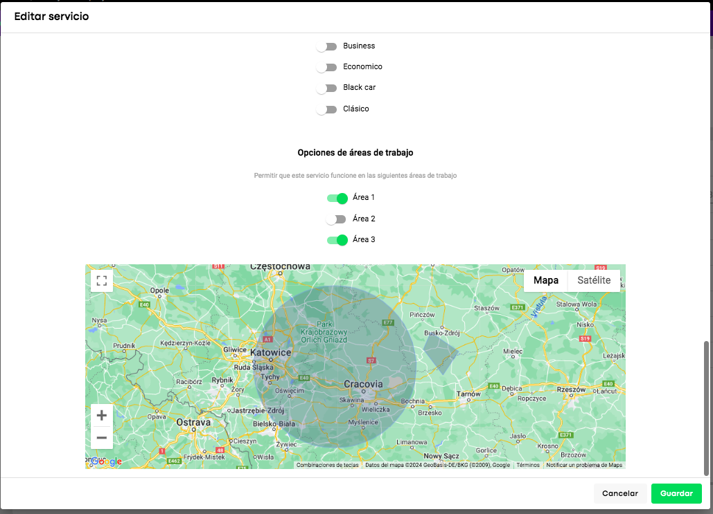 Después de crear el área, elige los servicios que quieras prestar dentro del área
