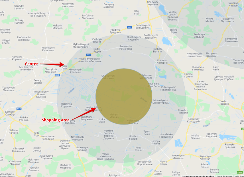 Por defecto, el área operativa de cada empresa se establece como un círculo con un radio de 18 km (ref. 1). El círculo está centrado en la ciudad especificada al registrarse para la prueba gratuita. El radio máximo del área operativa de un panel es de 100 km. Este límite se visualiza como un «círculo restrictivo» en el mapa (ref. 2).