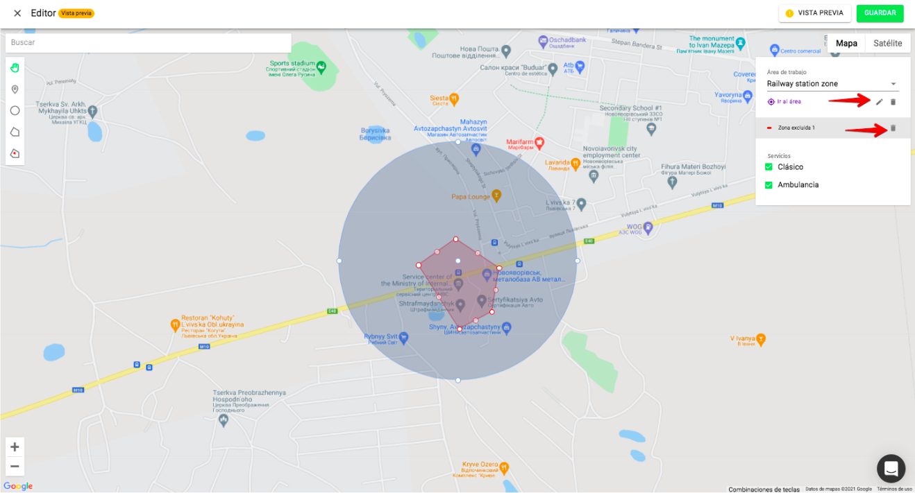 Para eliminar un área de trabajo o una zona de exclusión, haz clic en el icono de «papelera» junto al área/zona.