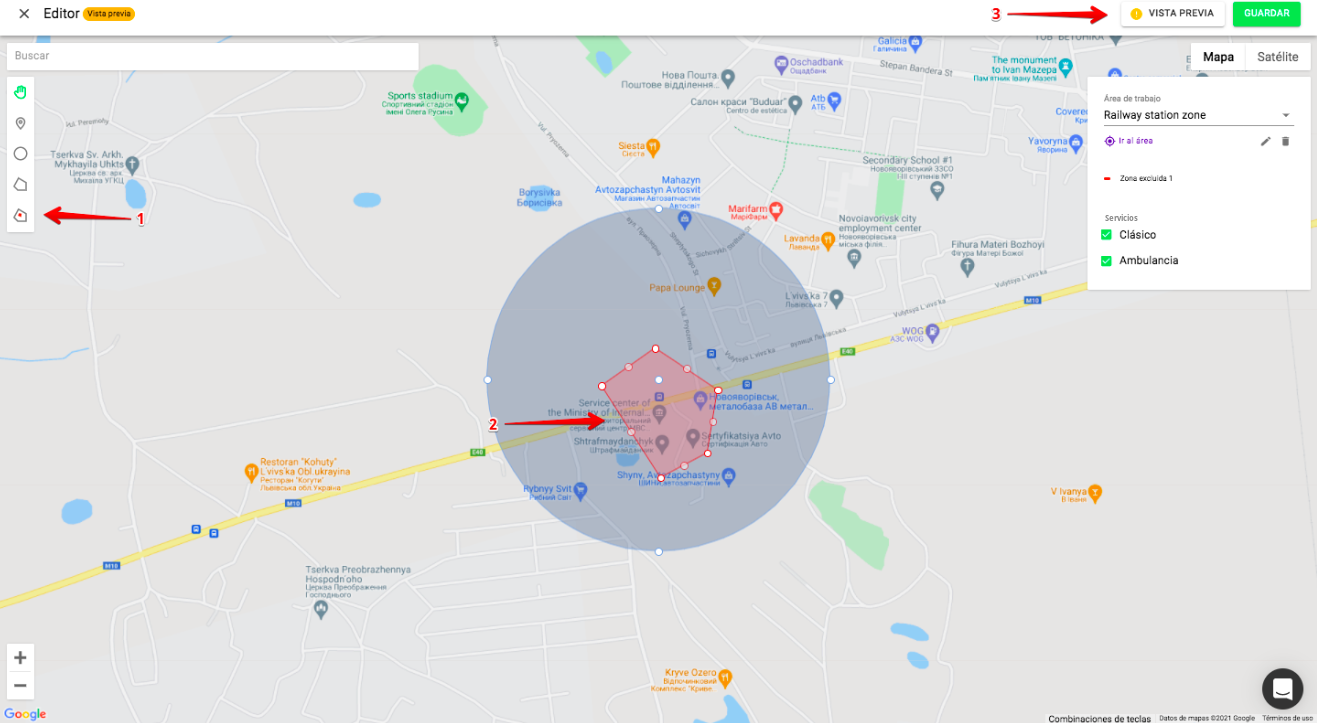 2. Para cambiar la forma de exclusiones/polígonos: coloca el puntero en el pico del polígono y arrástralo en la dirección necesaria.