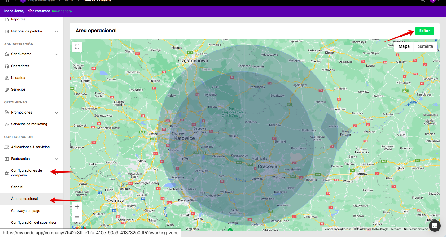 1. Accede a tu empresa > Abre «Configuración de la empresa» > Haz clic en el botón «EDITAR ÁREA OPERATIVA»