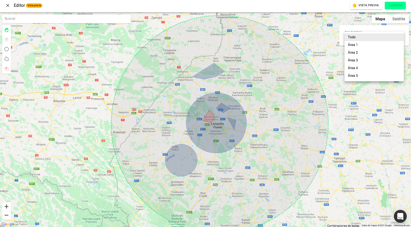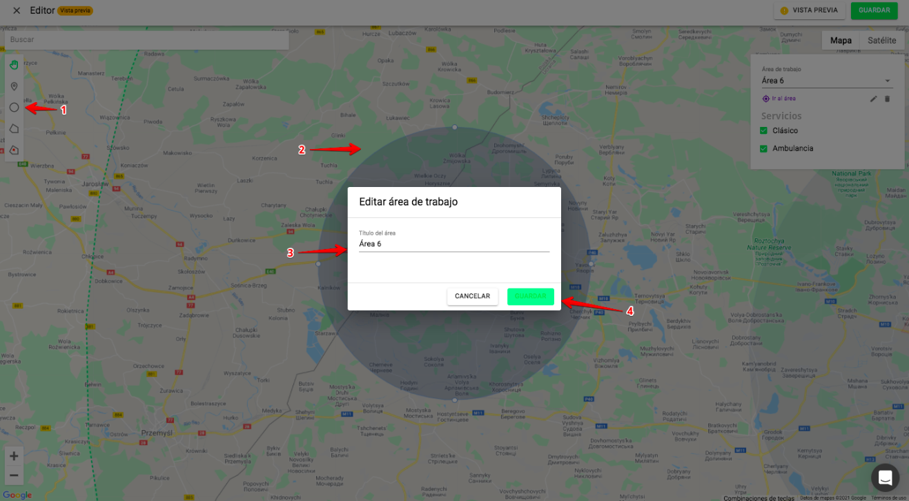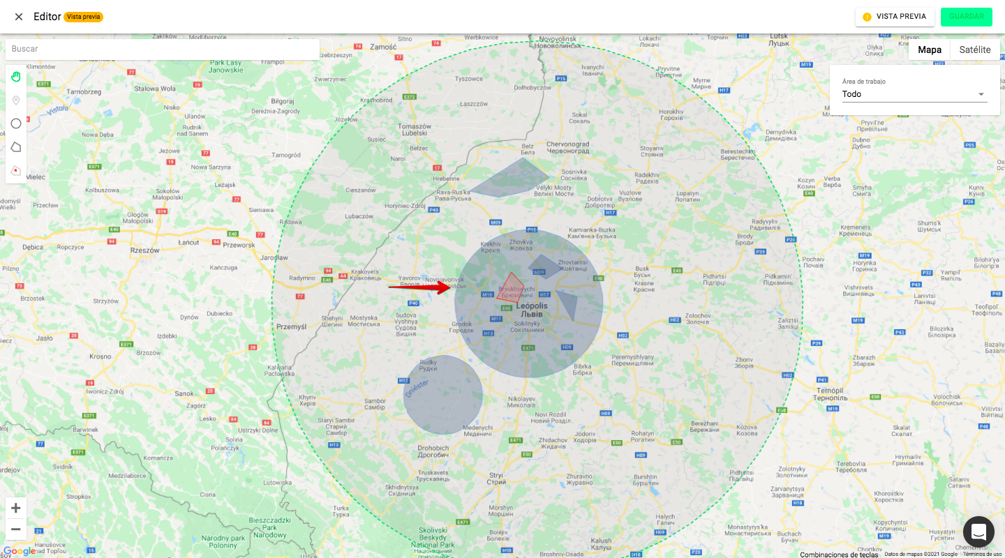 1. Se pueden dibujar zonas de trabajo personalizadas dentro de un «círculo restrictivo» con un radio de 100 km. La cobertura máxima del área de trabajo para una cuenta es de 200 km.