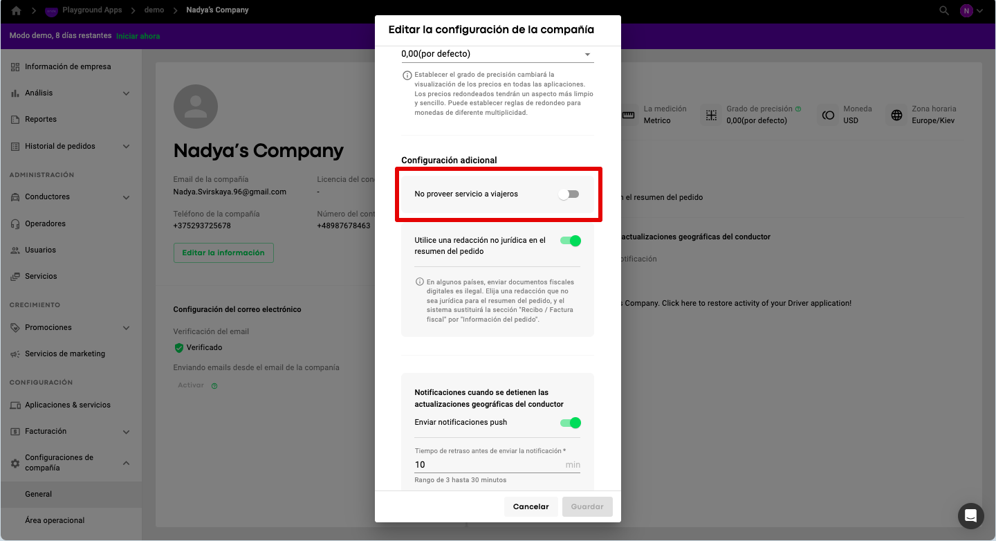 Para mostrar las servicios de tu empresa en las aplicaciones de viaje, accede a la pestaña de "Configuración de la compañía", desplázate hacia abajo en la página y asegúrate de que la casilla "No proveer servicio a los viajeros" no esté seleccionada.