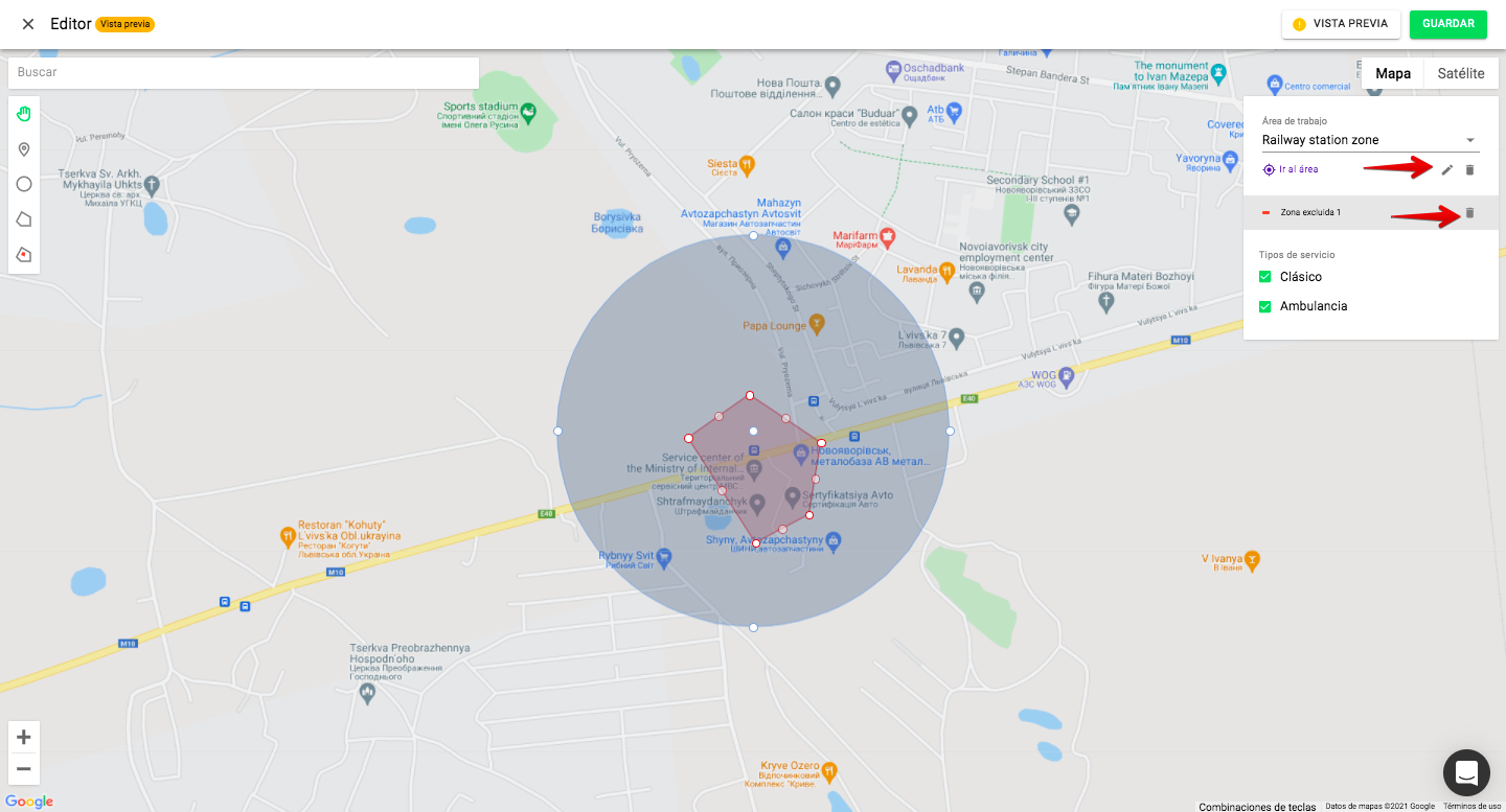 Para eliminar un área de trabajo o una zona de exclusión, haz clic en el icono de «papelera» junto al área/zona.