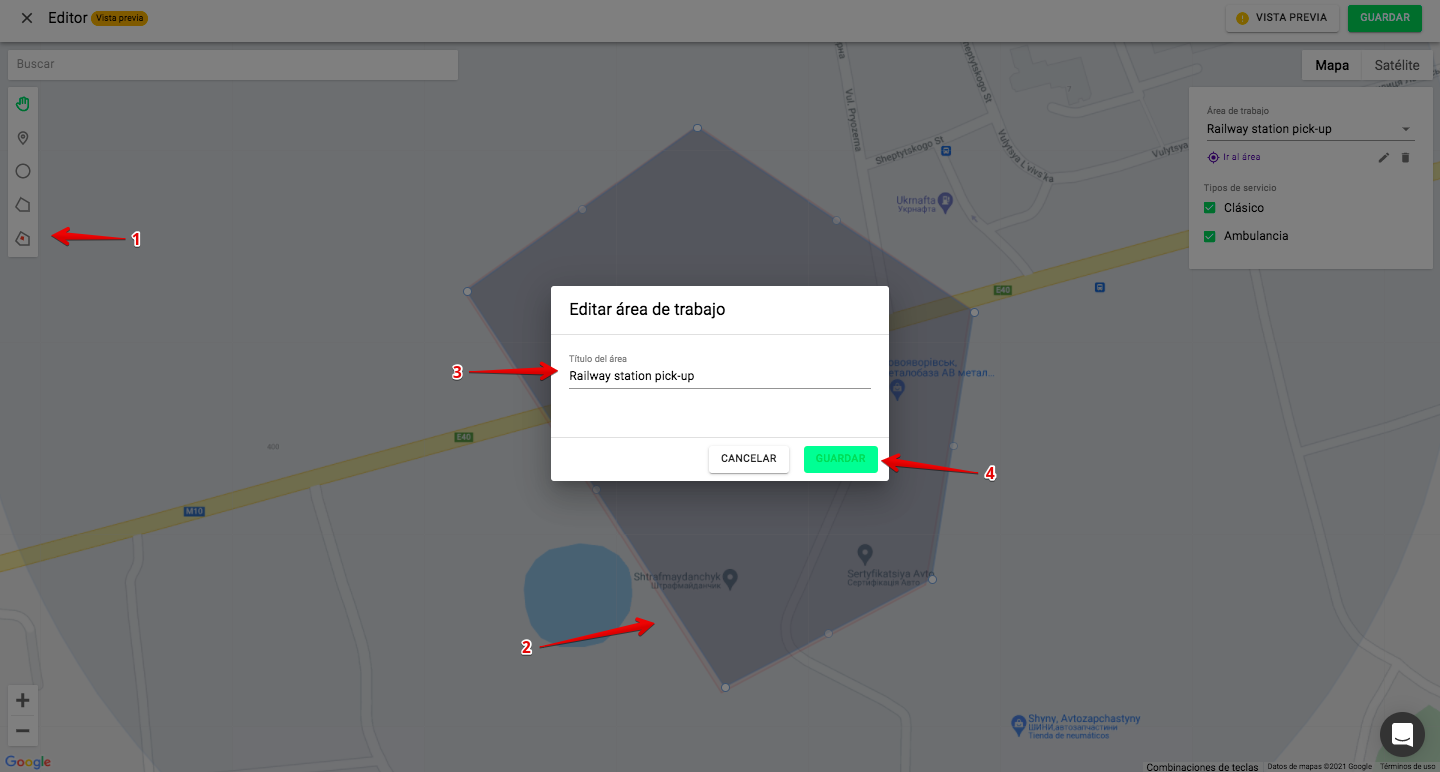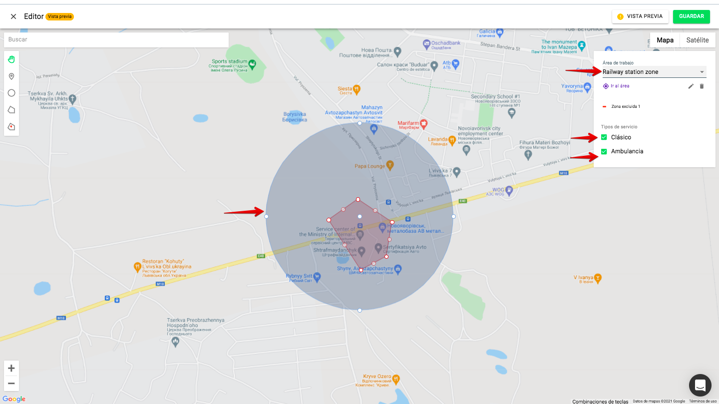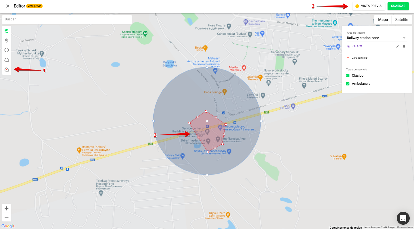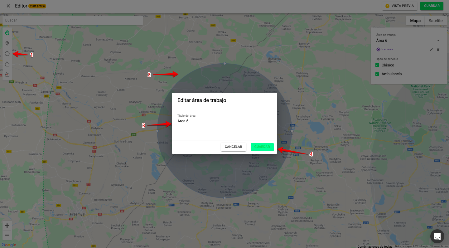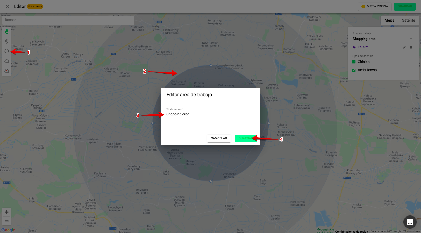 1. Se pueden dibujar zonas de trabajo personalizadas dentro de un «círculo restrictivo» con un radio de 100 km. La cobertura máxima del área de trabajo para una cuenta es de 200 km.