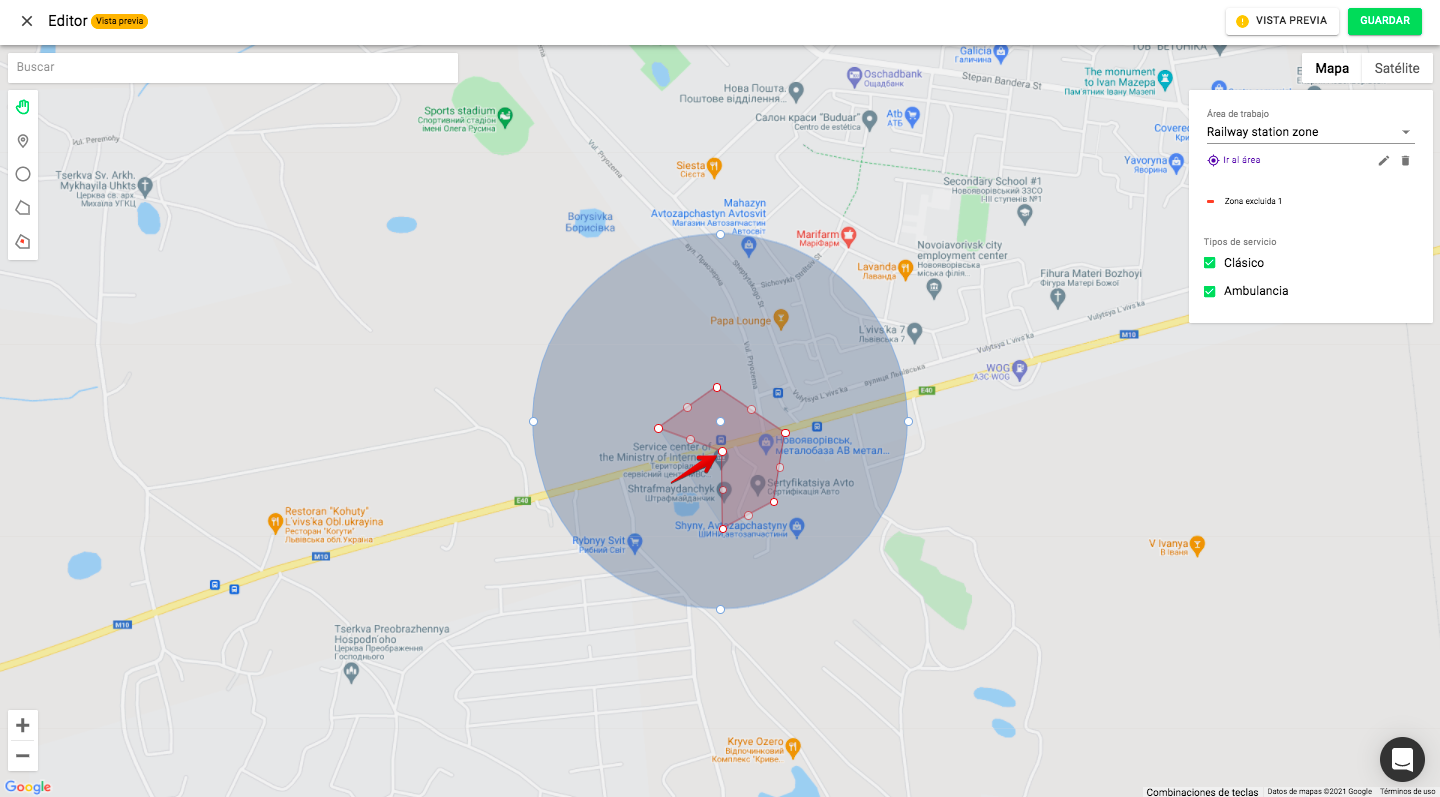 2. Para cambiar la forma de exclusiones/polígonos: coloca el puntero en el pico del polígono y arrástralo en la dirección necesaria.