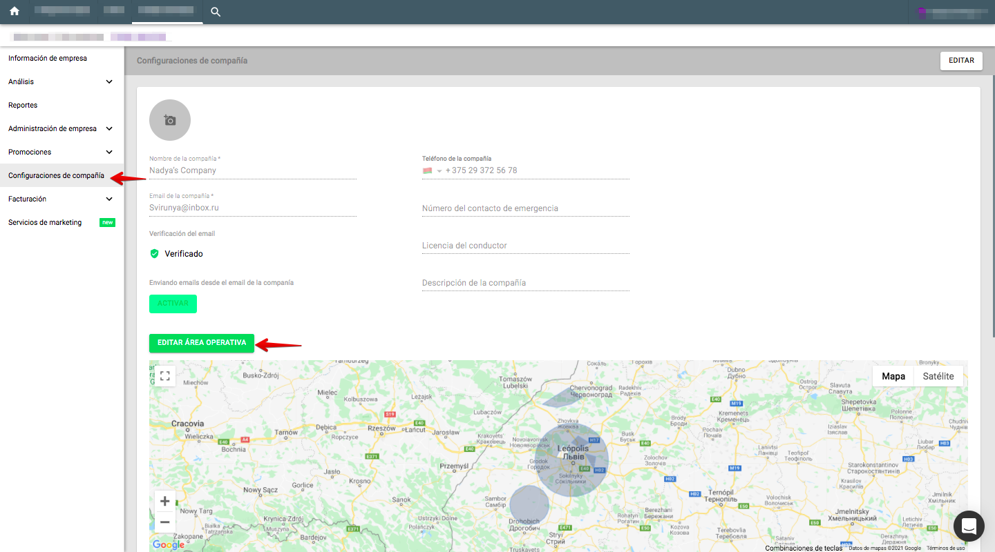 1. Accede a tu empresa > Abre «Configuración de la empresa» > Haz clic en el botón «EDITAR ÁREA OPERATIVA»