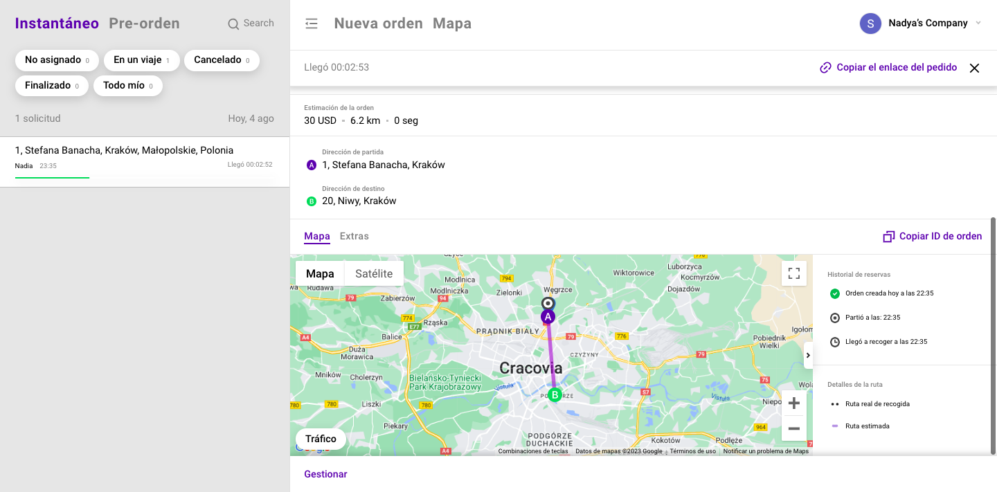 Para los pedidos con múltiples destinos, las rutas de línea directa se dibujan entre todos los puntos según su secuencia en el pedido.
