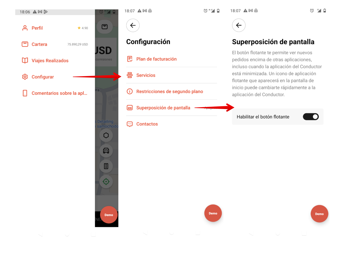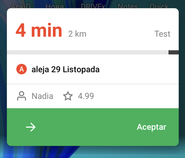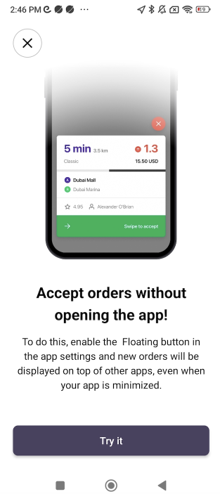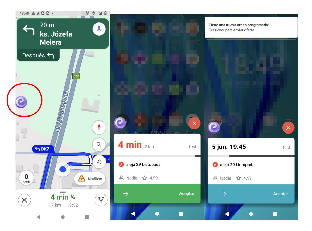 La función de superposición de pantalla permite a los conductores con dispositivos Android aceptar órdenes sin abrir la aplicación. Simplemente habilita la superposición de pantalla en la configuración de la aplicación y los nuevos pedidos se mostrarán encima de otras aplicaciones, incluso si tu aplicación está minimizada.