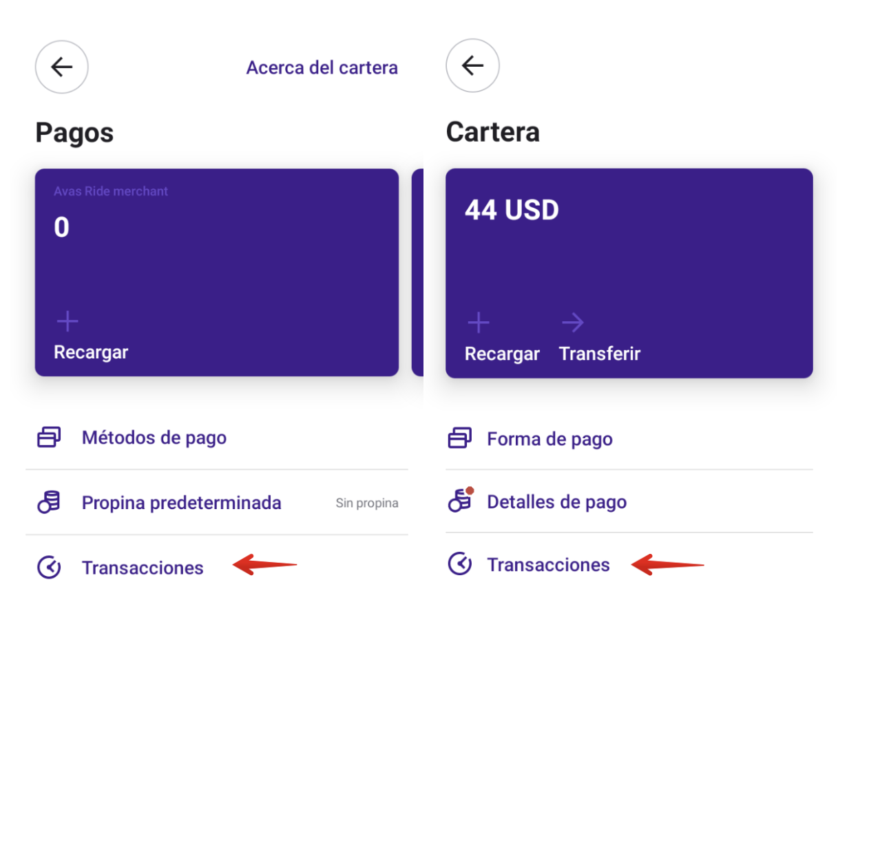 El cliente y el conductor pueden revisar todas las recargas de Apple Pay en sus transacciones en las aplicaciones.