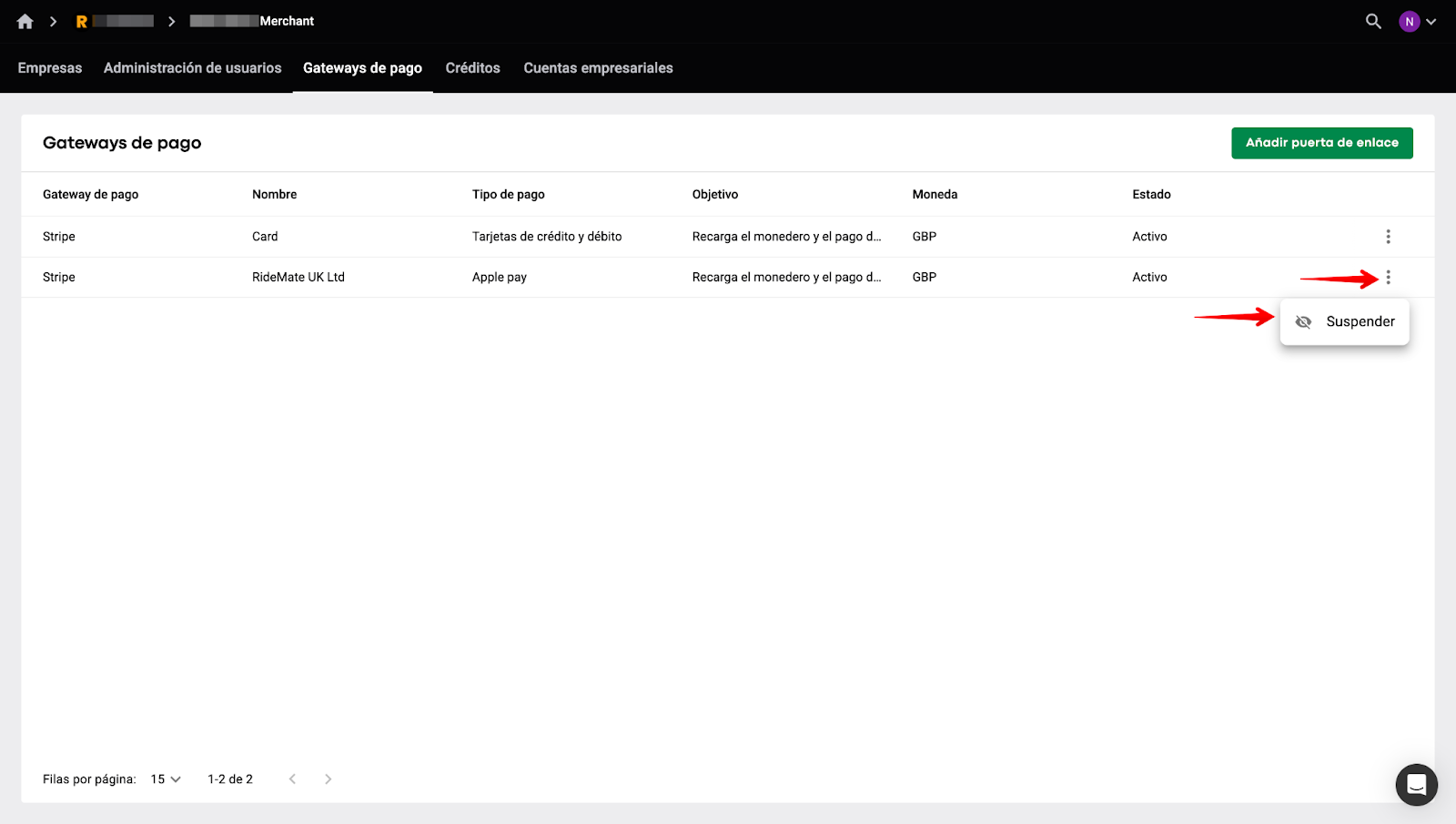 Para suspender el gateway, coloca el cursor sobre tu cuenta de Apple Pay, toca el botón "más ítems" y selecciona la opción "Suspender".