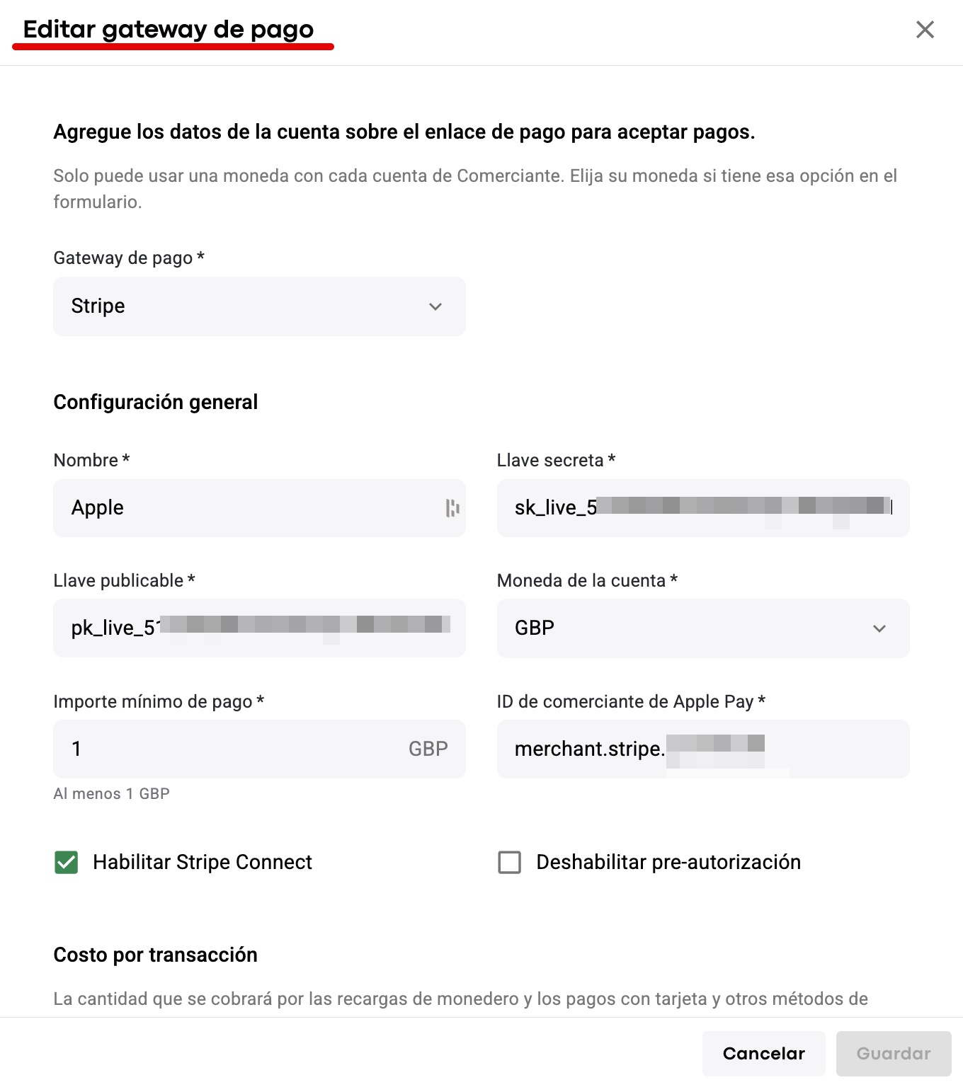 En caso de que se agregue una tarifa por transacción para el Gateway de pago en el Comerciante, también se aplicará a las recargas con Apple Pay.