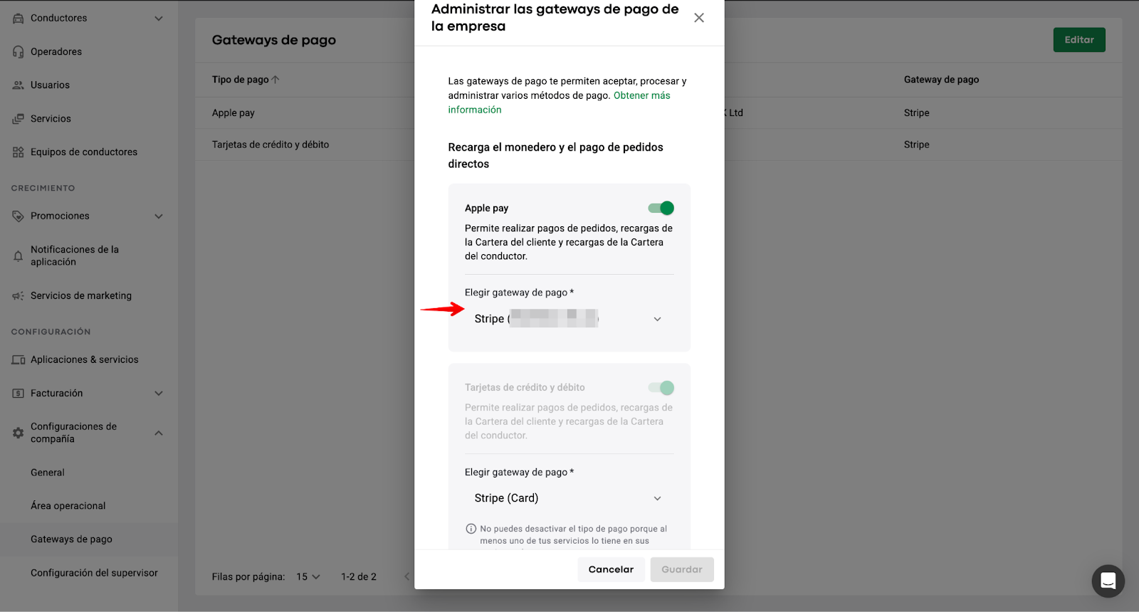 My hub > Configuración de la empresa > Gateways de pago > Editar > cambia el interruptor para "Recarga de Cartera y pago directo de pedidos" y selecciona Checkout.com, Hyperpay o Stripe de la lista desplegable debajo de "Elegir gateway de pago".