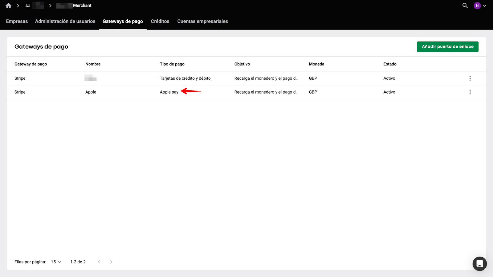Para editar los detalles de la cuenta de Apple Pay, ve a la pestaña Gateways de pago de su Comerciante y toca el gateway: