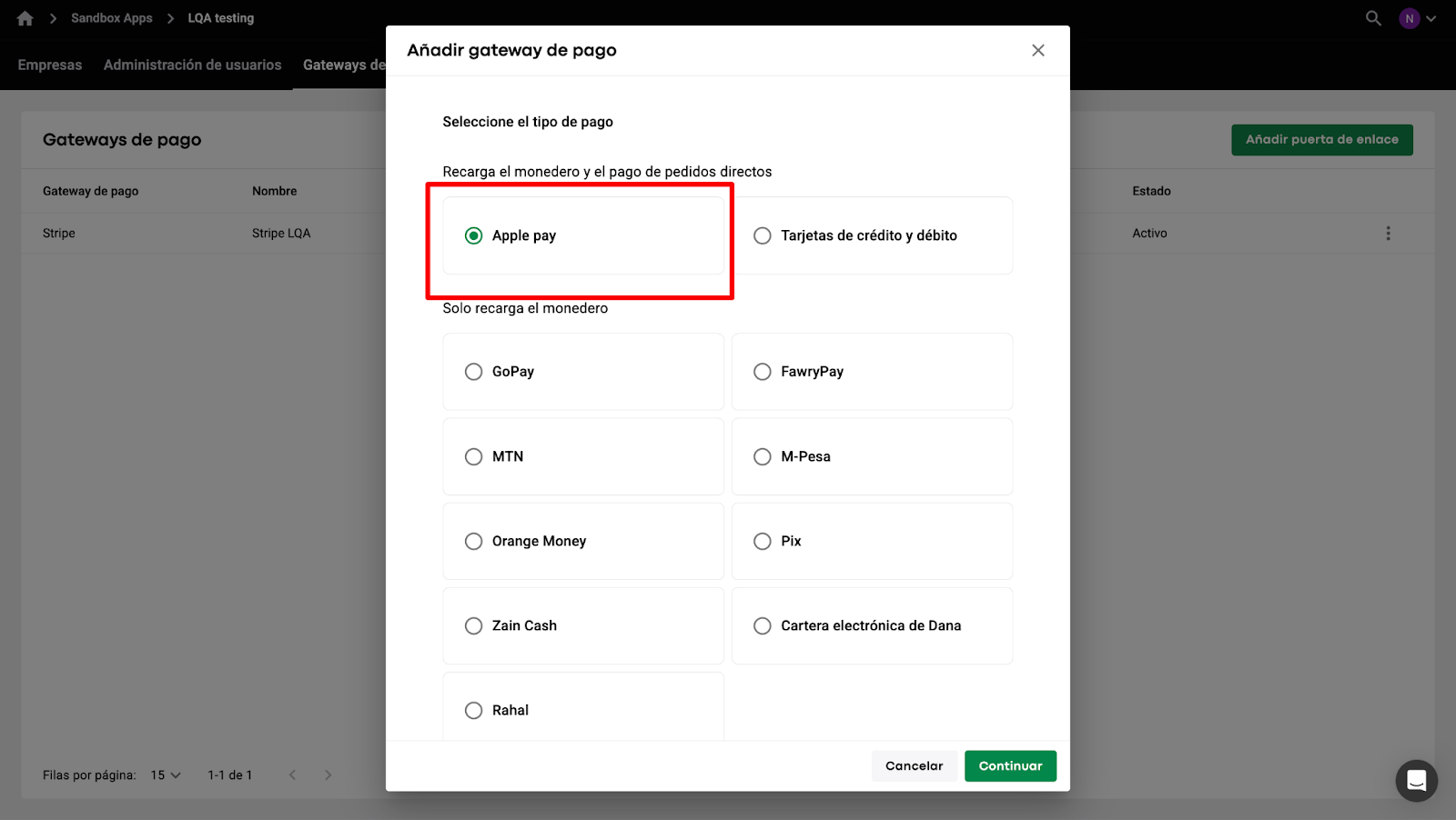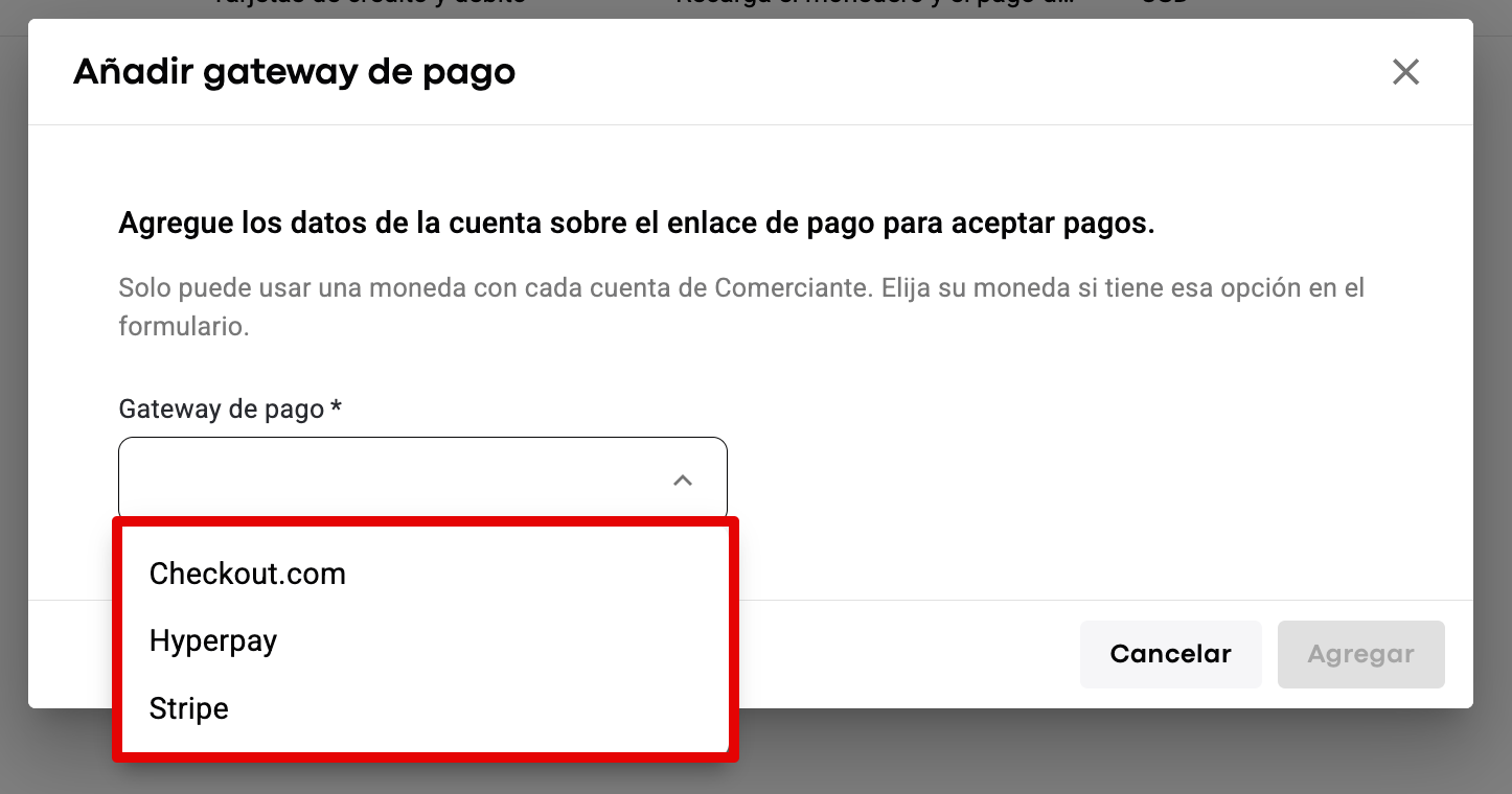 Para agregar Apple Pay, accede a tu Comerciante > ve a la pestaña "Gateways de pago" > toca en AGREGAR > selecciona "Apple Pay" en "Recarga de Cartera y pago directo" > toca CONTINUAR > elige Checkout.com, Hyperpay o Stripe de la lista desplegable de gateways de pago > agrega tus claves comerciales y toca en GUARDAR para finalizar.