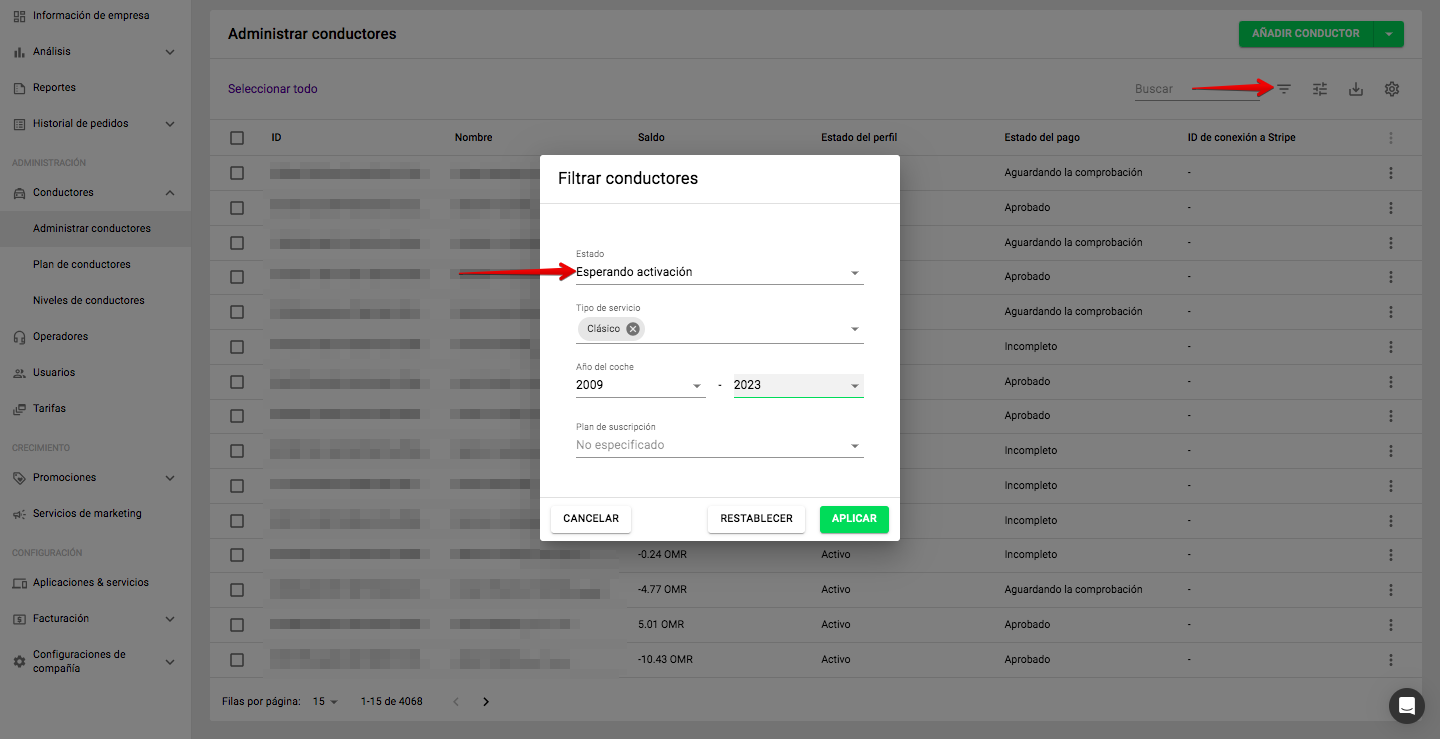1. Filtrar la lista de conductores por el estado deseado, el tipo de servicio y/o el plan de conductor