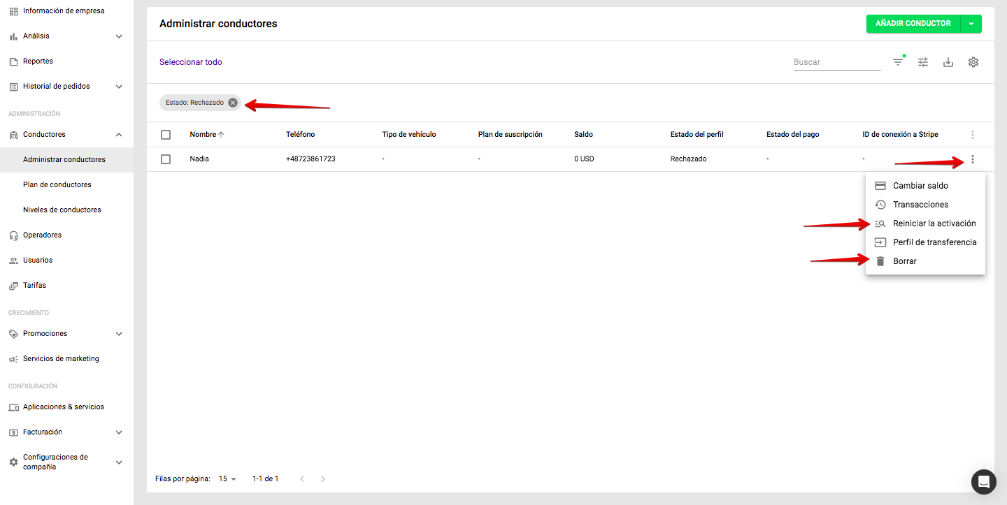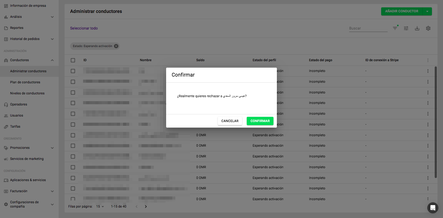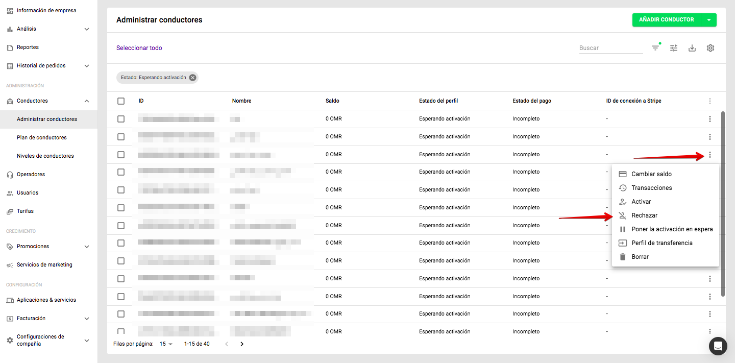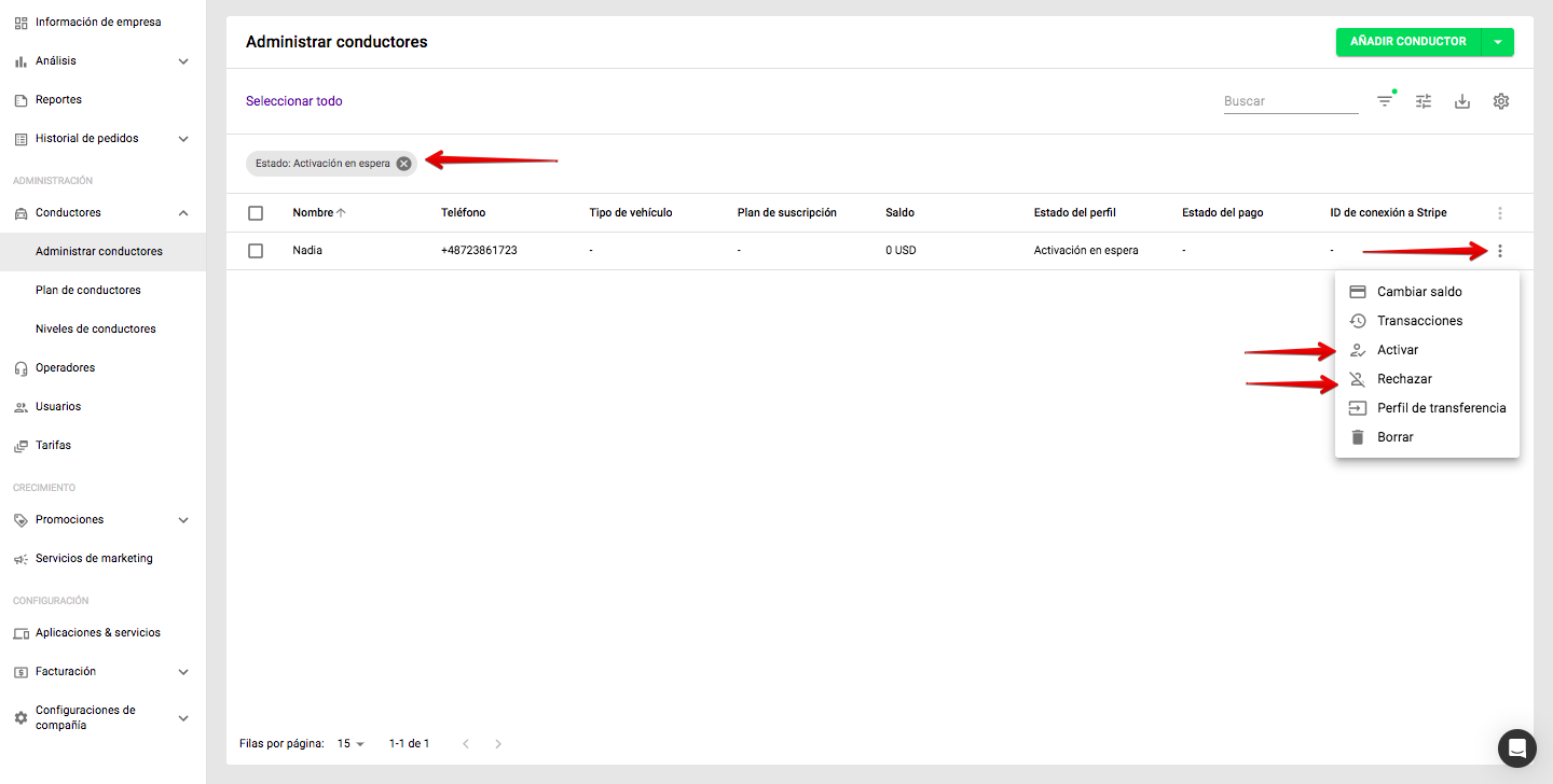 Selecciona un conductor con el estado "Esperando activación", toca el botón "Más elementos", selecciona la opción "Rechazar" y termina, seleccionando "CONFIRMAR" en la ventana emergente. Ahora el estado del conductor cambió a "Rechazar".