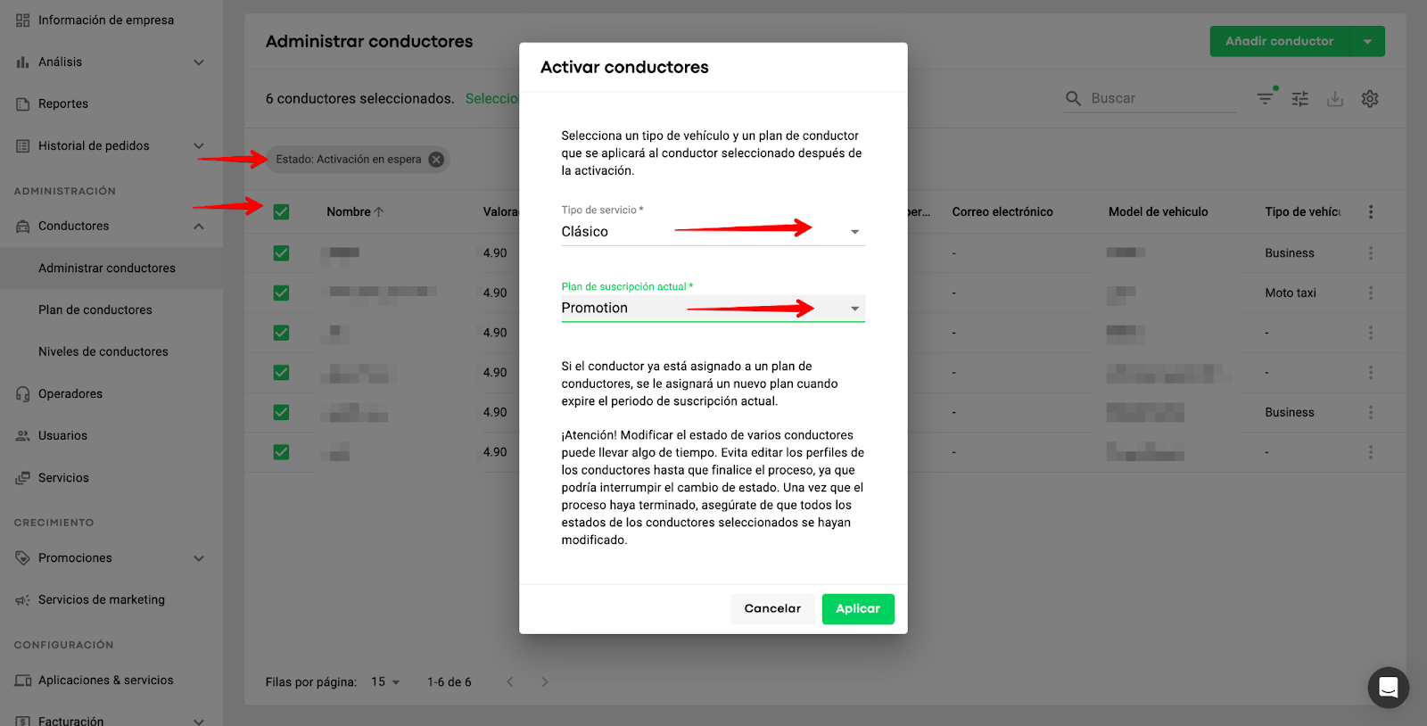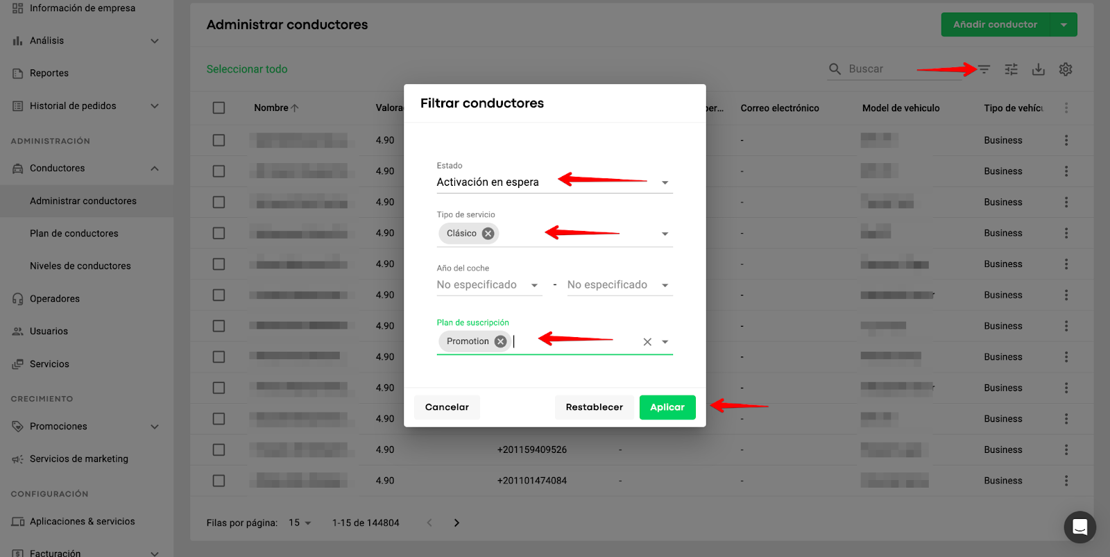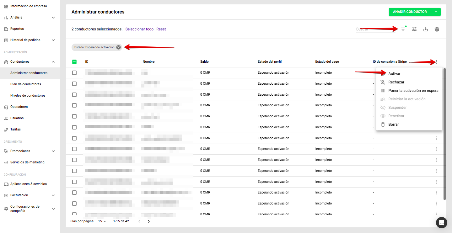 Para activar a todos los conductores seleccionados en el filtro, debes seguir estos pasos: