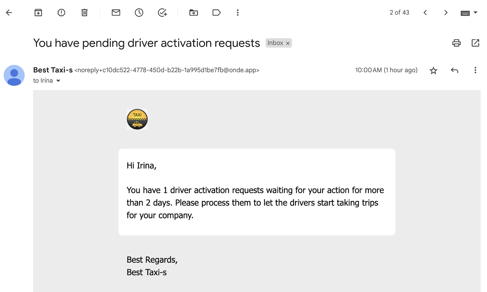 Una vez al día a las 10 a.m., si al menos 1 perfil de un conductor está pendiente en el estado de "Esperando activación" durante más de 48 horas después de la presentación de la solicitud, un usuario de la empresa con acceso completo o con acceso a Conductores y Operaciones con permiso de edición de los conductores recibirá un correo electrónico o un SMS (si se agrega un número de teléfono al perfil).