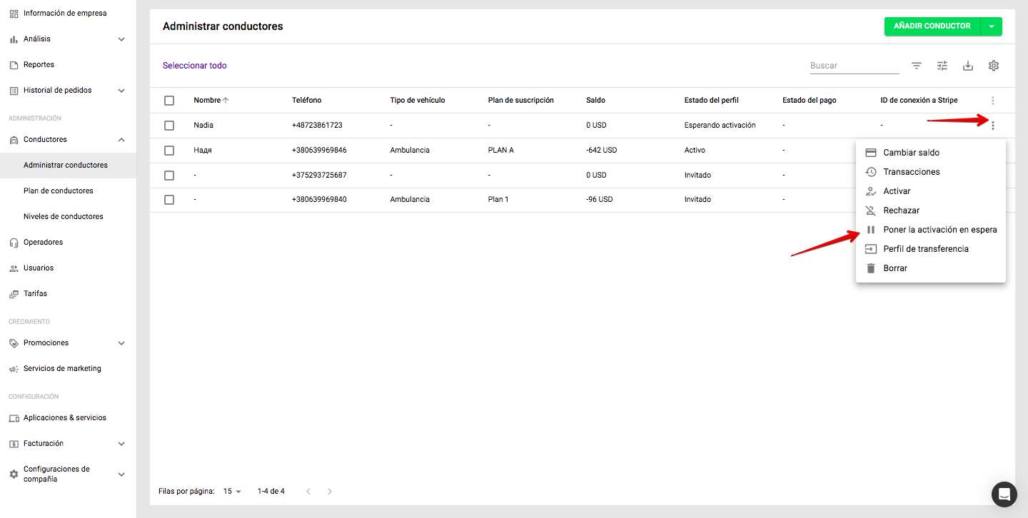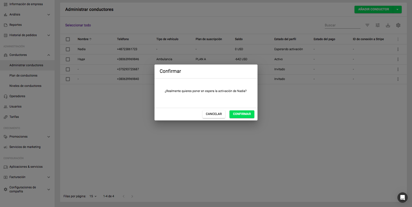 Ahora selecciona un conductor con el estado "Esperando activación", toca el botón "Más elementos", selecciona la opción "Poner activación en espera" y termina, seleccionando "CONFIRMAR" en la ventana emergente. Ahora el estado del conductor ha cambiado a "Activación en espera".