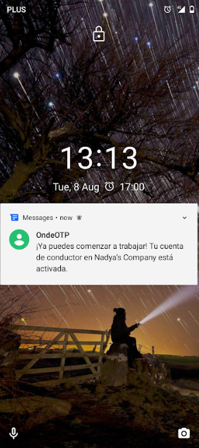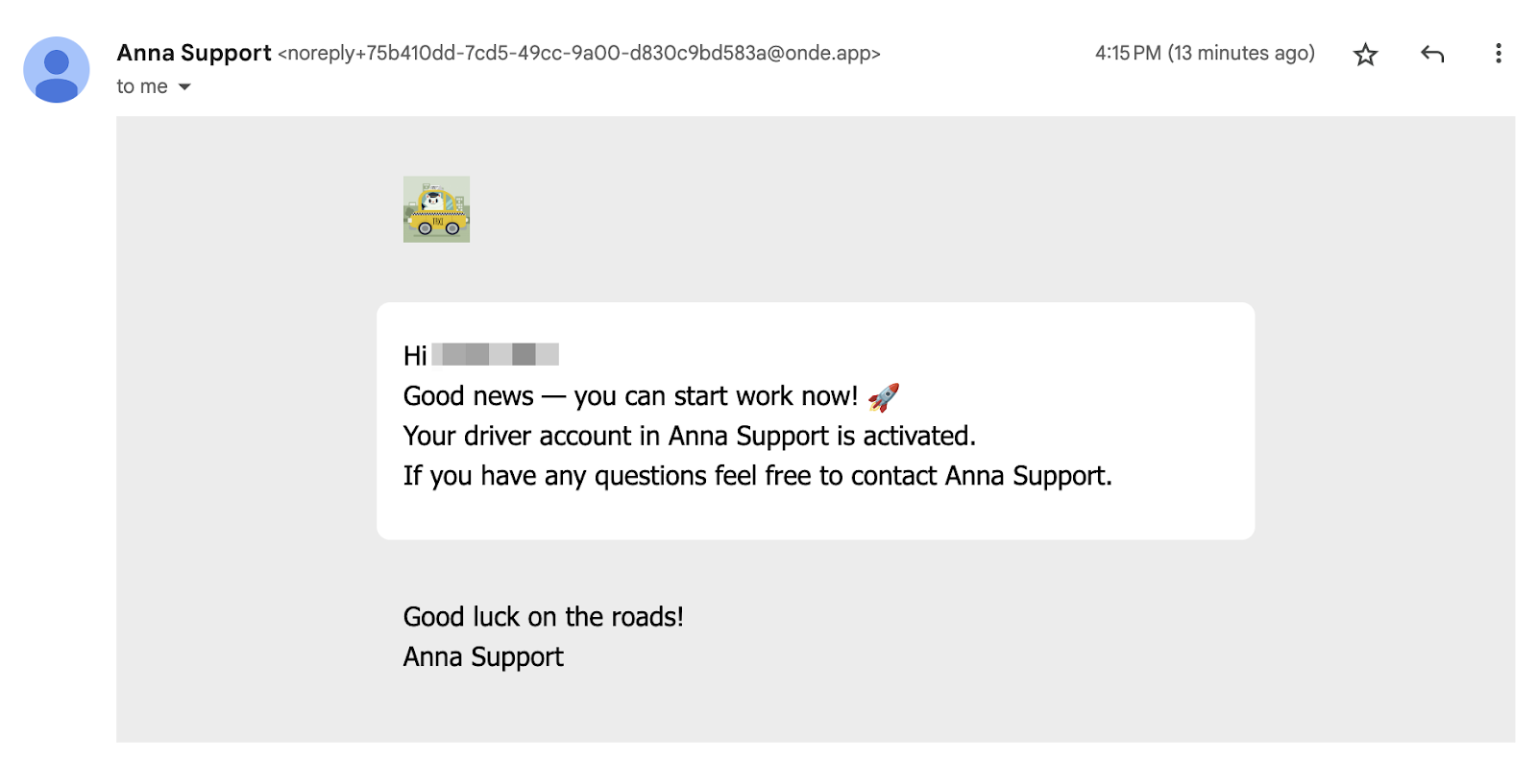 A todos los conductores se les notifica sobre su activación a través de un SMS enviado al número que se encuentra en su perfil y un correo electrónico (si está añadido en el perfil del conductor).