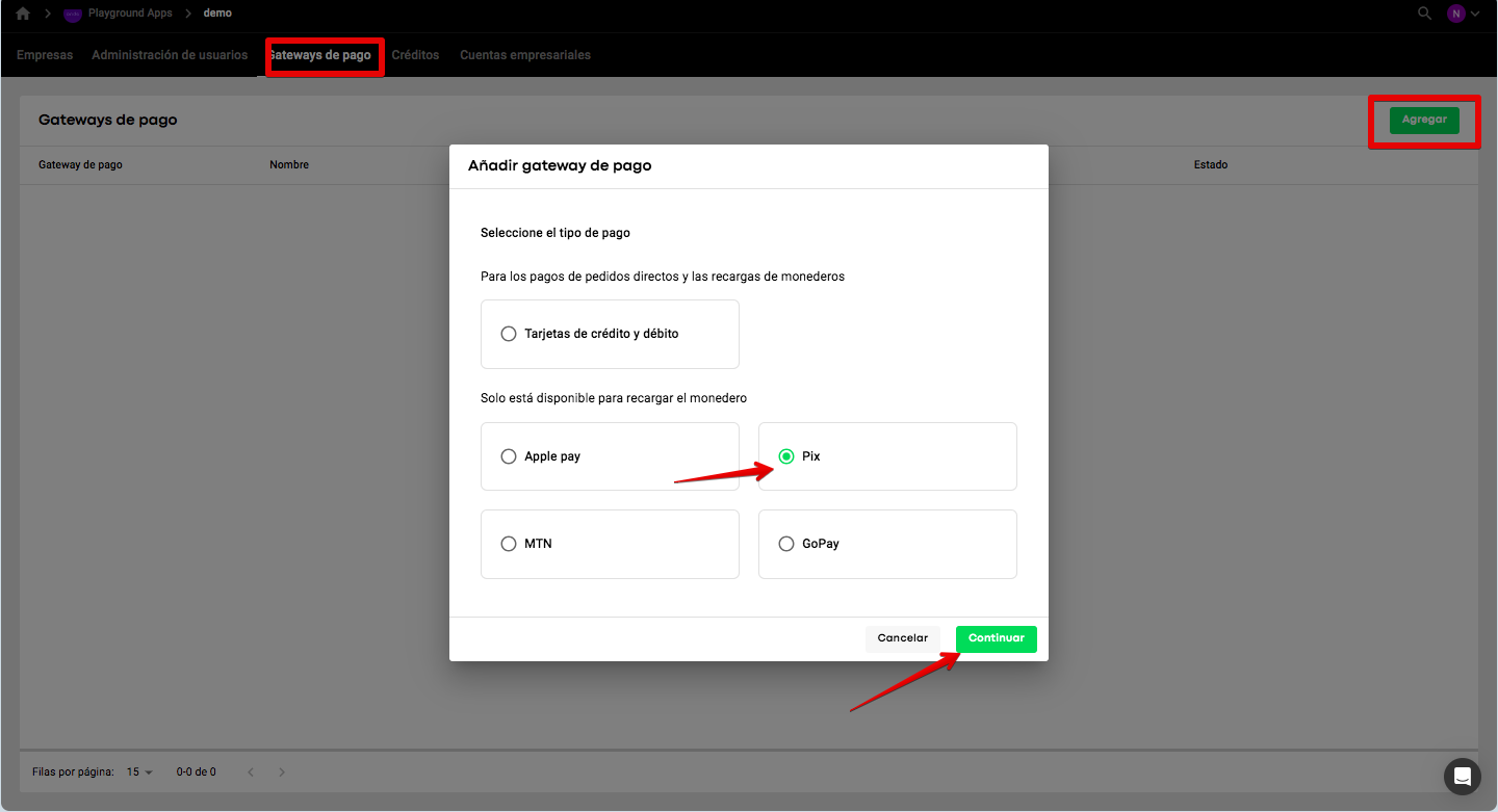 Para agregar Pix para las recargas de la Cartera de conductor y cliente, ve a la pestaña "Gateways de pago" > selecciona Pix en "Solo para recargas de la Cartera" > toca CONTINUAR > elije de la lista desplegable de gateways de pago, completa todas las claves y toca "GUARDAR" para finalizar.