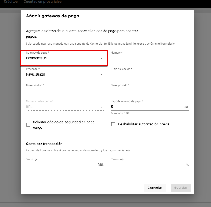 En caso de que se agregue "Tarifa por transacción" en PaymentsOs para "Para recargar la Cartera", se aplicará a cada recarga de la Cartera del cliente con Pix.