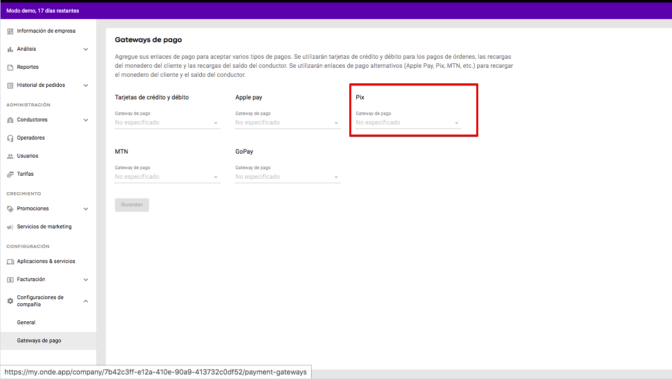 Una vez hecho esto, ve a Mi Hub > Configuración de la empresa > Gateways de pago y habilita el gateway de PaymentsOs para Pix.