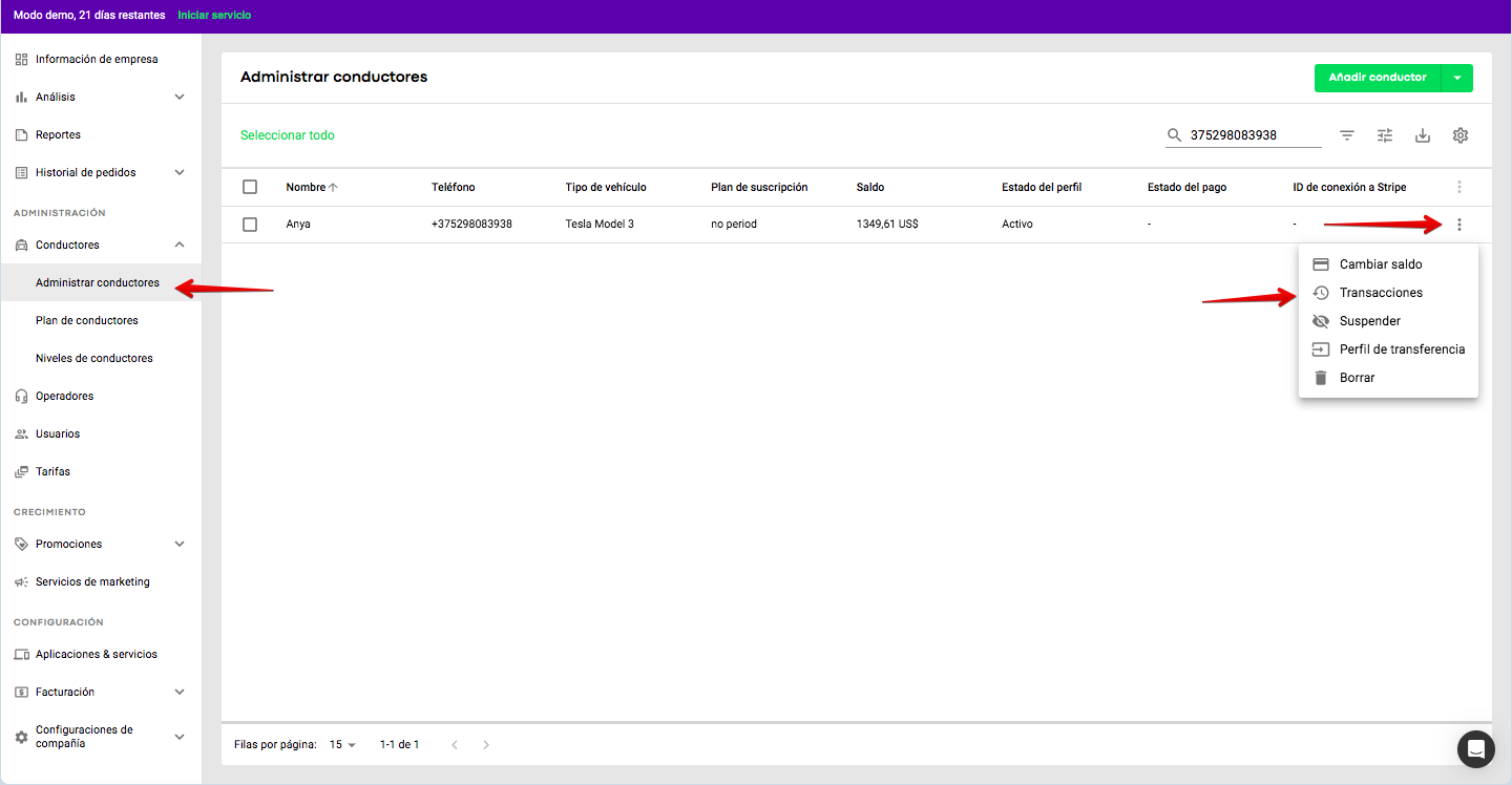 Puedes buscar cualquier transacción en el saldo de un conductor mediante el ID de transacción. Accede a Transacciones de los conductores > añade el ID de la transacción en el campo "Buscar por ID de la transacción" > verifica el resultado.