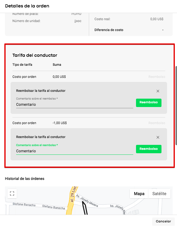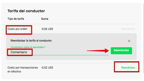 Al acceder a los detalles de la orden, un manager puede revisar todas las tarifas que se le han cobrado al conductor en la sección de "Tarifa del conductor" y realizar los reembolsos correspondientes.
