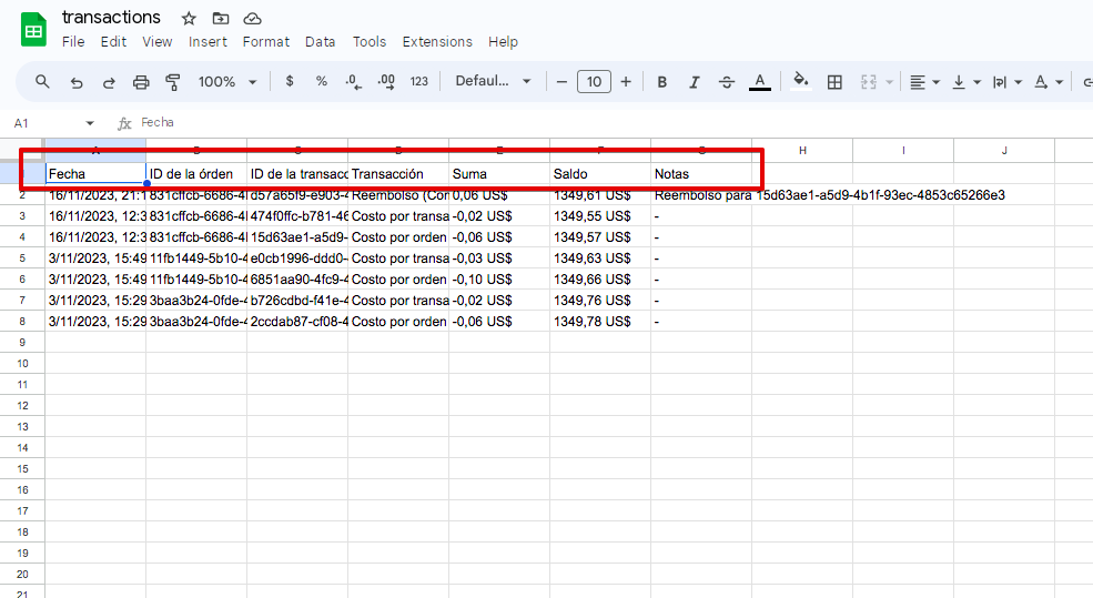 3. El campo Notas (disponible solo para transacciones de reembolso) hará referencia al ID de transacción del cargo de la tarifa inicial. El mismo ID de transacción se registra en el campo "ID de la transacción" del cargo de la tarifa.