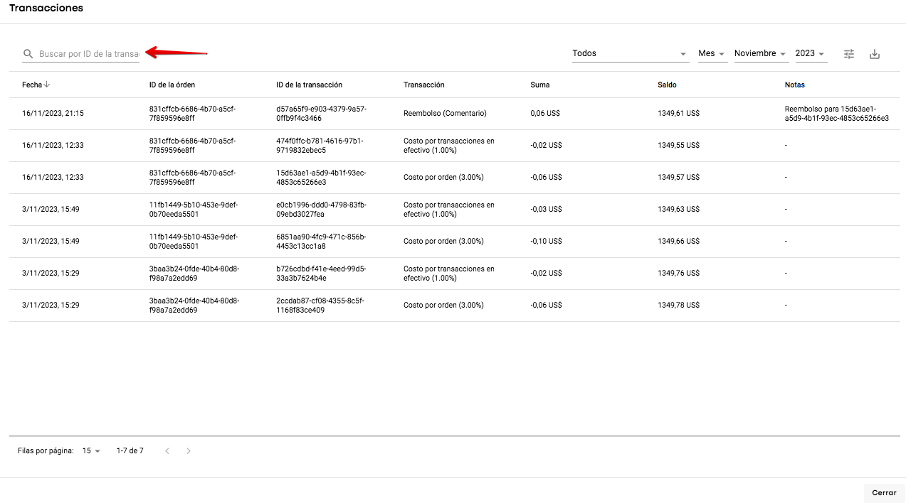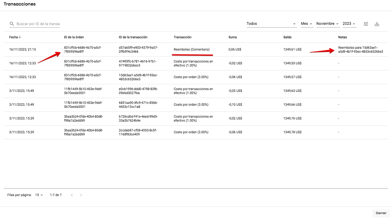 Los reembolsos se pueden rastrear en el reporte de transacciones de conductores y filtrarse por la columna de la categoría de transacción. También se puede buscar la transacción por su ID, verificar el ID de la transacción reembolsada, el monto del reembolso, el comentario, etc.